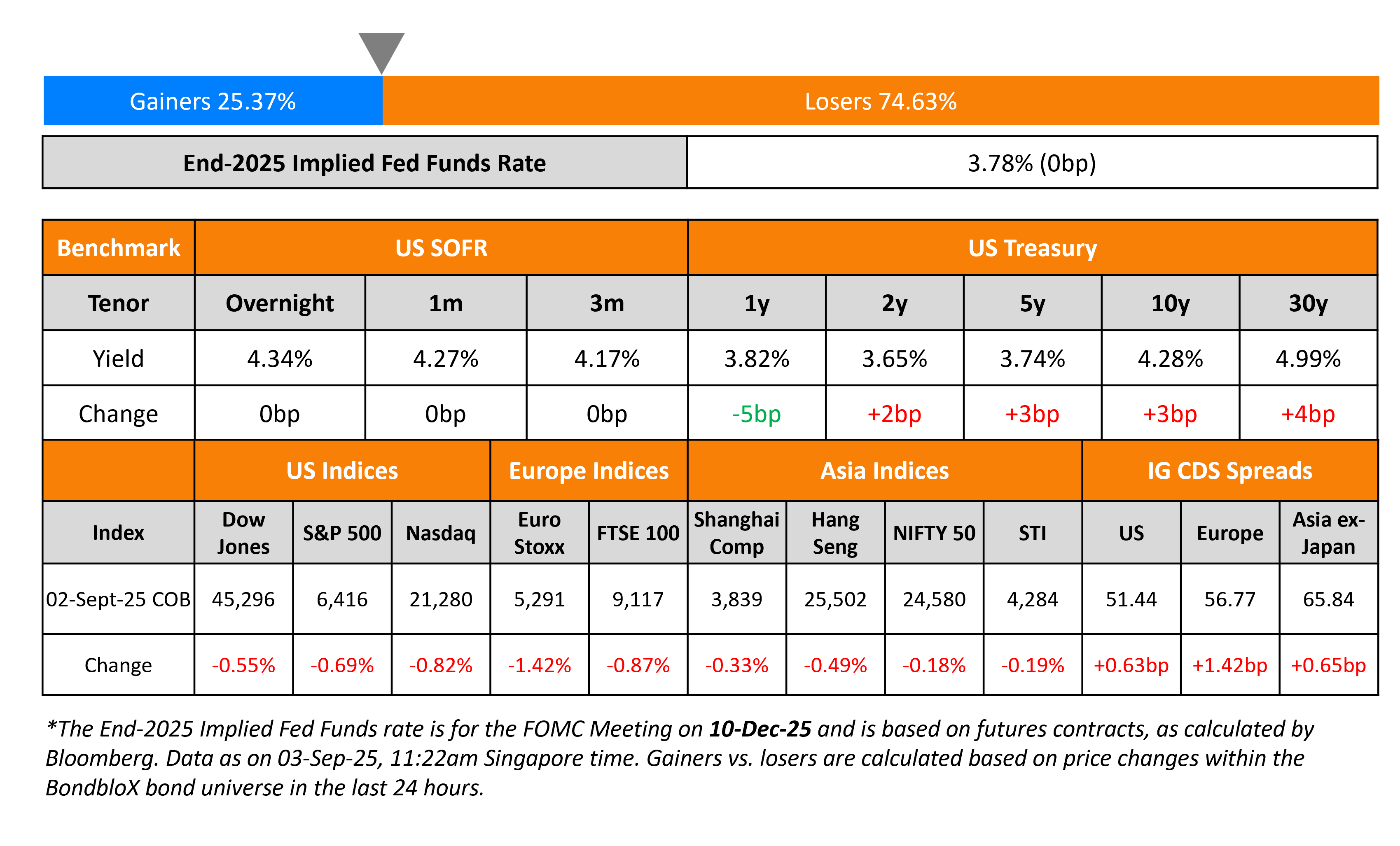 US Treasury yields inched higher by ~3bp across the curve. On the data front, the ISM Manufacturing PMI for August came-in at 48.7, contracting for a sixth straight month and also coming-in worse than expectations of a 49.0 print. While the Prices Paid subcomponent came-in softer than expectations, the New Orders index moved into expansionary territory (above the 50-reading) from the earlier contractionary reading. The tariff narrative continued to dominate the commentary from manufacturers as per the ISM survey.