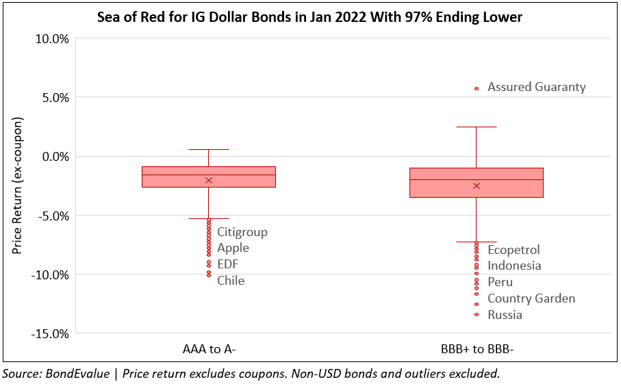 January was the fifth consecutive month where dollar bonds in our universe ended the month lower with 92% of bonds in the red. The US 2Y Treasury yield soared 44bp in January after market participants increased expectations of the US Federal Reserve’s first rate hike in March 2022 from the initially expected June. With that, a faster balance sheet runoff and the possibility of a fourth rate hike have risen after the Fed sounded hawkish in its January meeting. The probability of a 25bp rate hike in March rose from 20% at the start of December 2021 to over 50% at the start of January to 94% as of February 3. The 10Y Treasury yield too jumped 29bp to 1.80% at end-January. This led to a terrible month for bonds, especially investment grade (IG) bonds that are more sensitive to interest rate changes compared to high yield (HY) bonds, all else equal. 97% of IG dollar bonds ended January in the red, compared to 85% of HY dollar bonds that ended the month lower. Bloomberg noted that a global index of IG bonds posted their worst start to the year in over two decades, with total return losses of 2.2%.