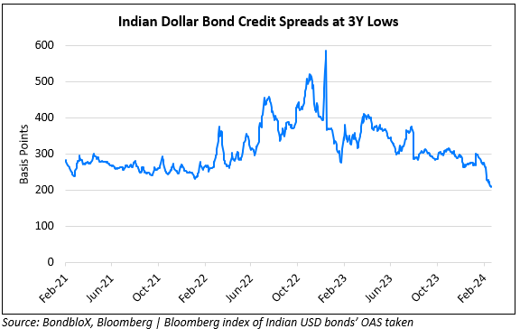 As seen in the animated chart below, Z-Spreads of Indian dollar bonds have compressed from its levels seen in January 2023. To view the individual bonds, pause the chart (top left) and hover over the dots.