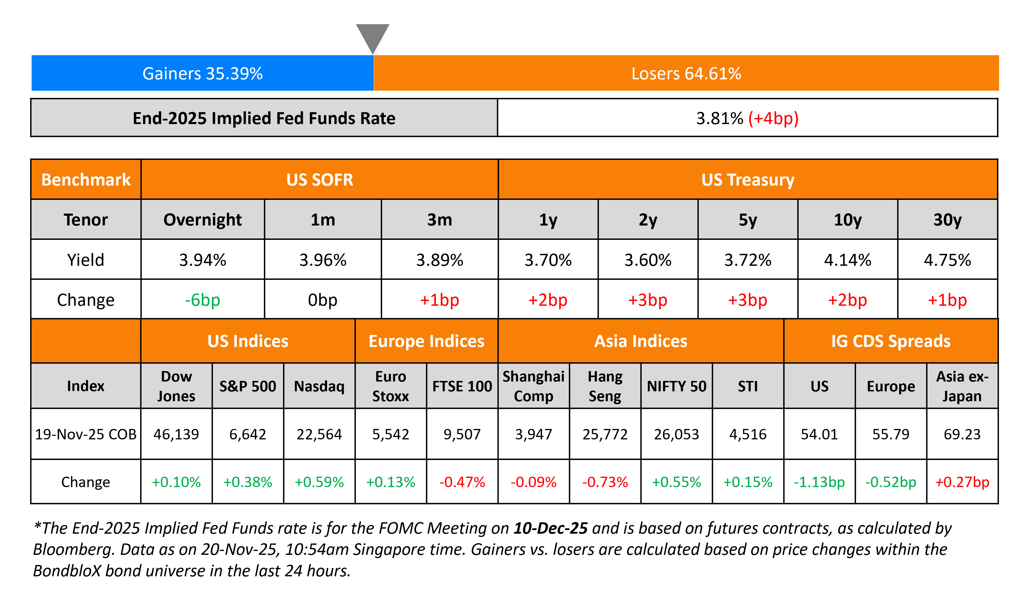 US Treasury yields rose by 2-3bp across the curve. The Fed’s October meeting minutes noted that “many participants” thought it would be appropriate to keep the target range unchanged for the rest of the year. However it also noted that “several participants” said another cut “could well be appropriate in December if the economy evolved about as they expected”. Separately, the BLS said that it will not be releasing its complete jobs report for October, due to inability to collect certain data. However it will provide some of the October data along with the full November jobs report on December 16. Thus, the October and November jobs data will not be available in time for the FOMC’s December meeting. Markets are now pricing-in only a 27% chance of a 25bp rate cut in the next FOMC meeting vs. nearly 45% a day prior.