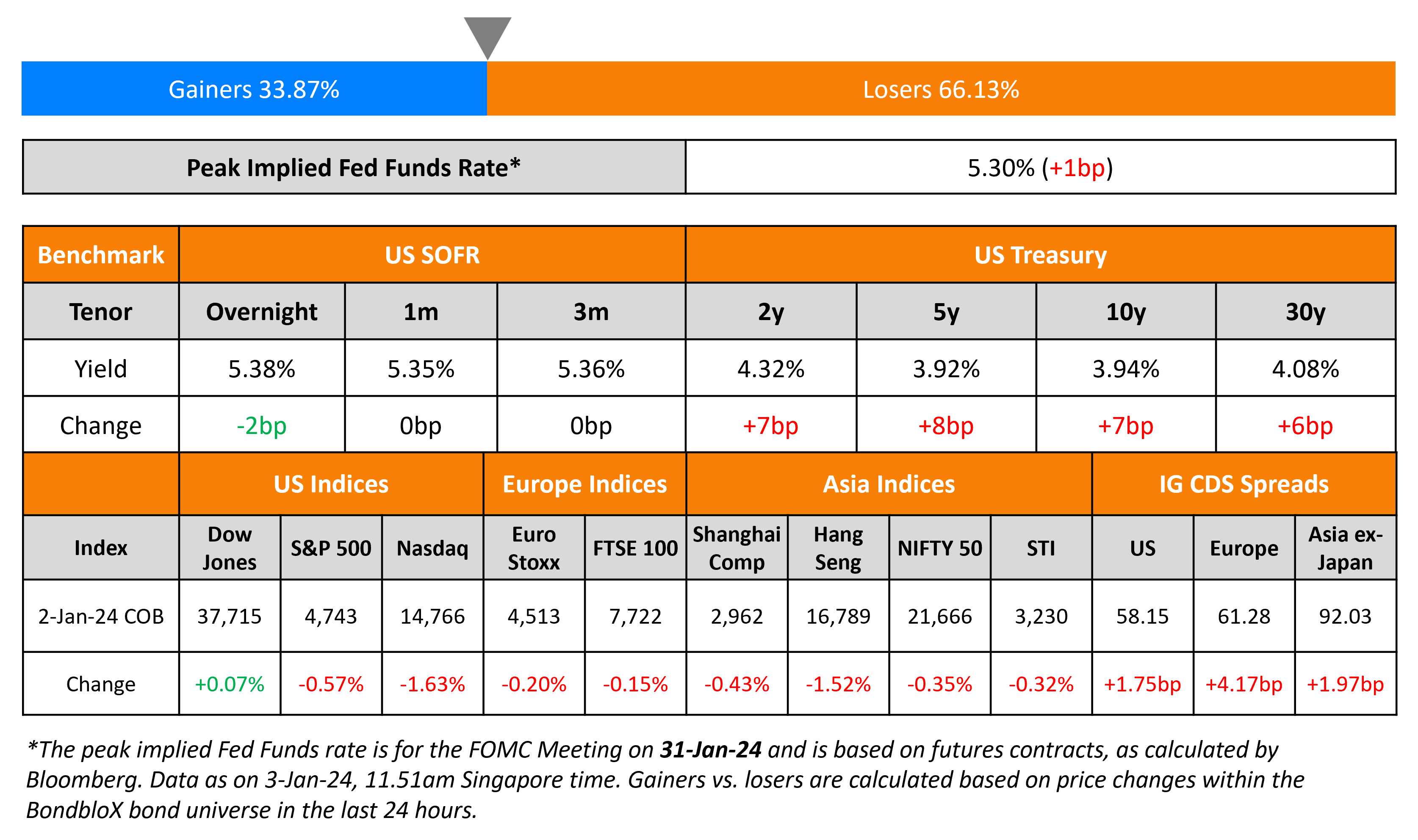 US Treasury yields jumped higher by 7-8bp across the curve. Primary markets saw a flurry of new issuances with US high grade issuers raising over $29bn yesterday. The peak Fed Funds Rate was 1bp higher at 5.30%. Markets await the ISM Manufacturing print later today, followed by the FOMC minutes. US credit markets saw IG CDS spreads widen by 1.8bp and HY spreads widen by 8bp. US equity markets ended lower yesterday to begin the new year, with the S&P falling 0.6% and Nasdaq falling 1.6%.