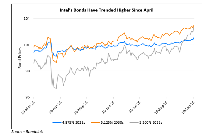 Intel’s bonds strengthened after NVIDIA announced a $5bn investment in the chipmaker alongside plans to jointly develop semiconductors. Analysts noted that the deal boosts confidence in Intel’s funding access and long-term competitiveness. The NVIDIA partnership follows the US government’s commitment last month to take a ~10% stake in Intel via the Chips Act and Secure Enclave funding, and SoftBank’s $2bn equity purchase in August. Intel, which had $50.8bn in debt at end-June, will also work with NVIDIA to develop chips for PCs and data centers as it looks to regain ground in the semiconductor race.