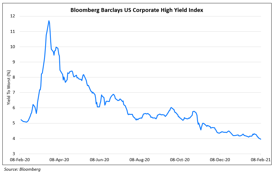 Positive investor sentiment driven by ultra-low interest rates, huge stimulus programs and Covid-19 vaccine rollouts have led yield-hungry investors to lap up junk-rated bonds since the new year began with record issuance of $52bn, the highest-ever January issuance. Yields have been falling across the board within junk-rated bonds with even CCC-rated average bond yields dropping to record lows of 6.21% despite being just three notches above default. David Norris, head of U.S. credit at TwentyFour Asset Management said, “This robust new issue pipeline of lower-quality credit is worth poring over as there are likely to be some good stories in here for investors with sufficient liquidity to get involved.”