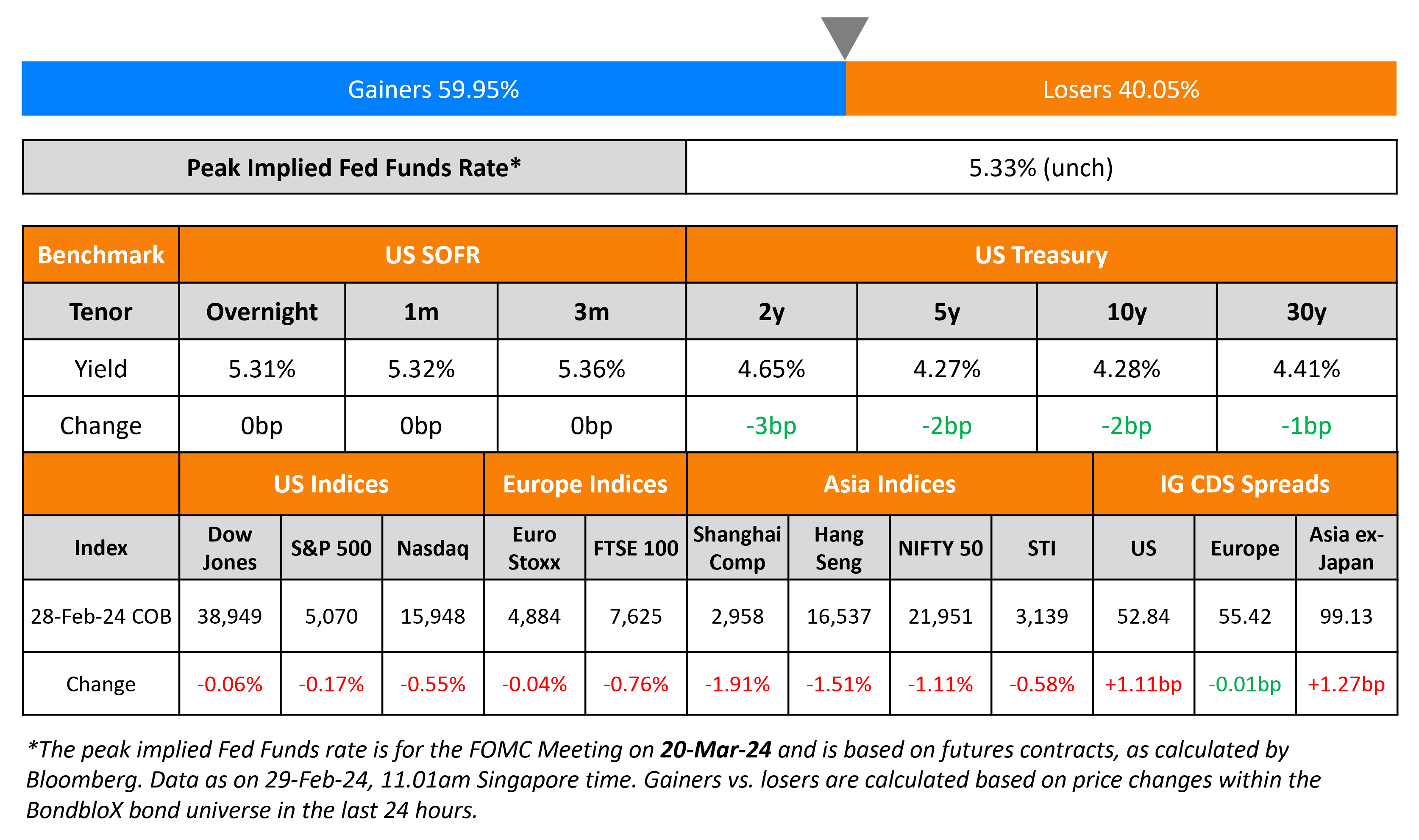 US Treasury yields were marginally lower across the curve, down by 1-3bp. US 4Q 2023 GDP (second estimate) came in slightly lower at 3.2% than the preliminary estimate of 3.3%. Also, the US congress reached a deal to provide one week of temporary funding to avert a partial government shutdown on March 2. New York Fed President John Williams said that more work was required to get inflation back to 2%, adding that the Fed “has the time” to take in data before making the call to cut rates. Separately, Boston Fed President Susan Collins repeated that “it will likely become appropriate to begin easing policy later this year”. Looking at credit markets, US IG CDS spreads widened 1.1bp and HY CDS spreads were 5bp wider. Equity markets closed lower with the S&P and Nasdaq down 0.2% and 0.6% respectively.
