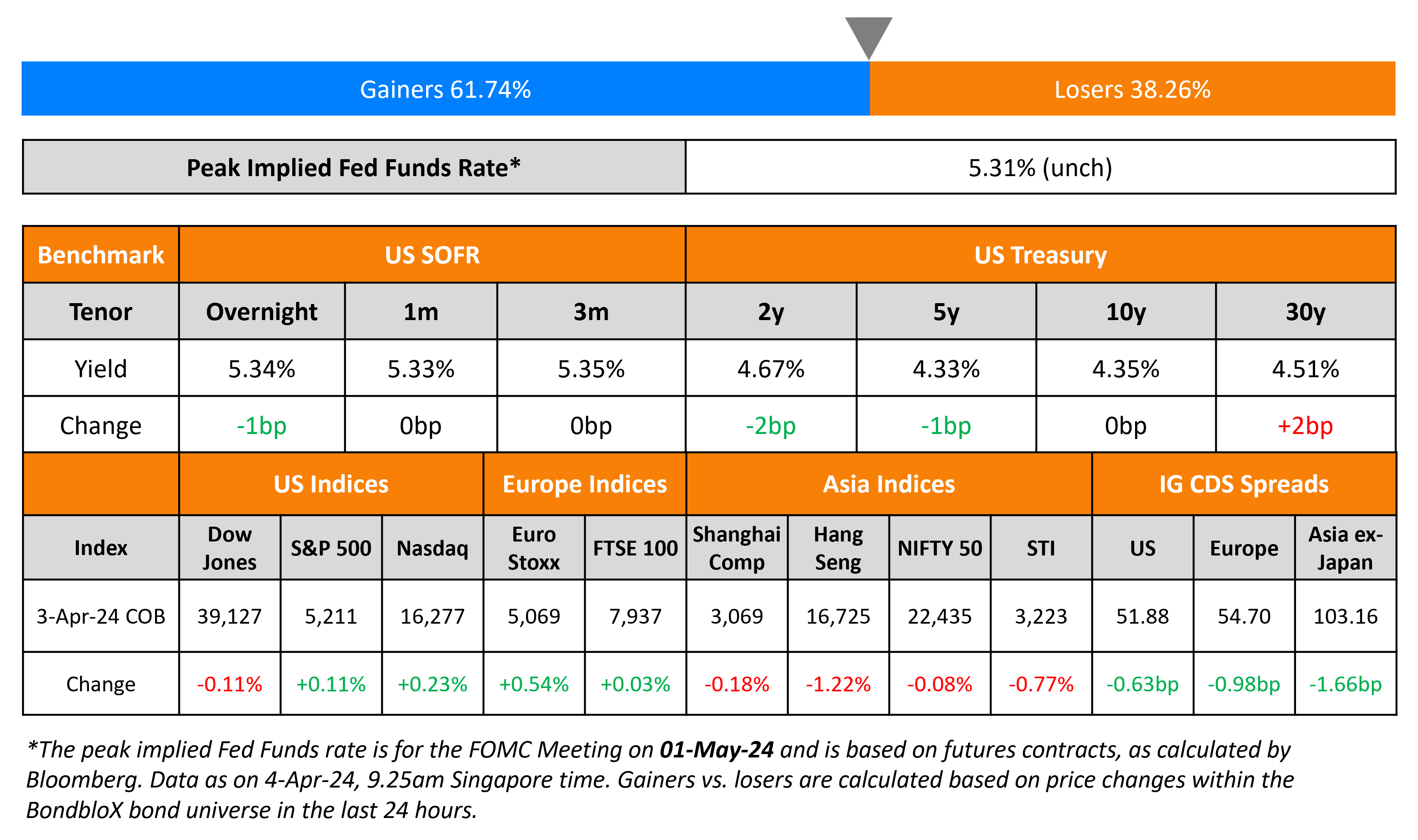 US Treasury yields were steady on Wednesday. US ISM Services PMI fell to 51.4 in March from 52.6 in February, and lower than expectations of 52.8. It was the second straight monthly decline since rebounding in January. Among the subcomponents, the Prices Paid Index dropped to 53.4, the lowest reading since March 2020, from 58.6 in February. Separately, US ADP Payrolls rose 184k in March from 155k, and was higher than expectations of`150k. Fed Chairman Jerome Powell said that it would be “too soon” to conclude that the higher recent inflation readings are “more than just a bump”. He restated that “if the economy evolves broadly as we expect, most FOMC officials see it as likely appropriate to begin lowering the policy rate at some point this year”. Credit markets saw the US IG CDS spreads tighten 0.7bp and the HY spreads tighten 2.8bp. Looking at equity indices, S&P and Nasdaq ended higher by 0.1% and 0.2% respectively.