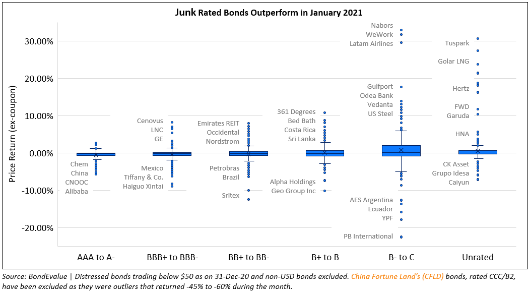 Dollar bonds’ performance in January 2021 was mixed with a negative bias. 39% of dollar bonds in our universe delivered a positive price return ex-coupon with the balance 61% in the red. Investor appetite for riskier debt was apparent with junk rated bonds outperforming investment grade rated bonds during the month. One prominent outlier in the high yield space was China Fortune Land (CFLD), which saw its dollar bonds plummet 45% to 60% through January on growing concerns about its liquidity position and ability to meet upcoming maturities. In the latest update on the Chinese developer, a creditor committee has been set up led by its two largest creditors, Ping An and ICBC. Bloomberg reported that the committee is scheduled to meet today to “to properly deal with the company’s liquidity risk and to protect the rights of financial creditors, with strong support from financial regulators and the local governments of Langfang city and Hebei province.”