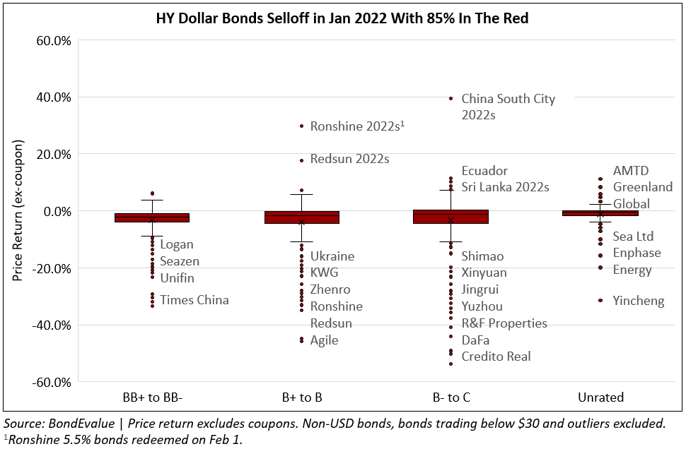 January was the fifth consecutive month where dollar bonds in our universe ended the month lower with 92% of bonds in the red. The US 2Y Treasury yield soared 44bp YTD after market participants increased expectations of the US Federal Reserve’s first rate hike in March 2022 from the initially expected June. With that, a faster balance sheet runoff and a possibility of a fourth rate hike have risen after the Fed sounded hawkish in its January meeting. The probability of a 25bp rate hike in March rose from 20% at the start of December 2021 to over 50% at the start of January; it currently stands at 94%. The 10Y Treasury yield too jumped 29bp to 1.80% at end-January. This led to a terrible month for bonds, especially investment grade (IG) bonds that are more sensitive to interest rate changes compared to high yield (HY) bonds, all else equal. 97% of IG dollar bonds ended January in the red, compared to 85% of HY dollar bonds that ended the month lower. Bloomberg noted that a global index of IG bonds posted their worst start to the year in over two decades, with total return losses of 2.2%.