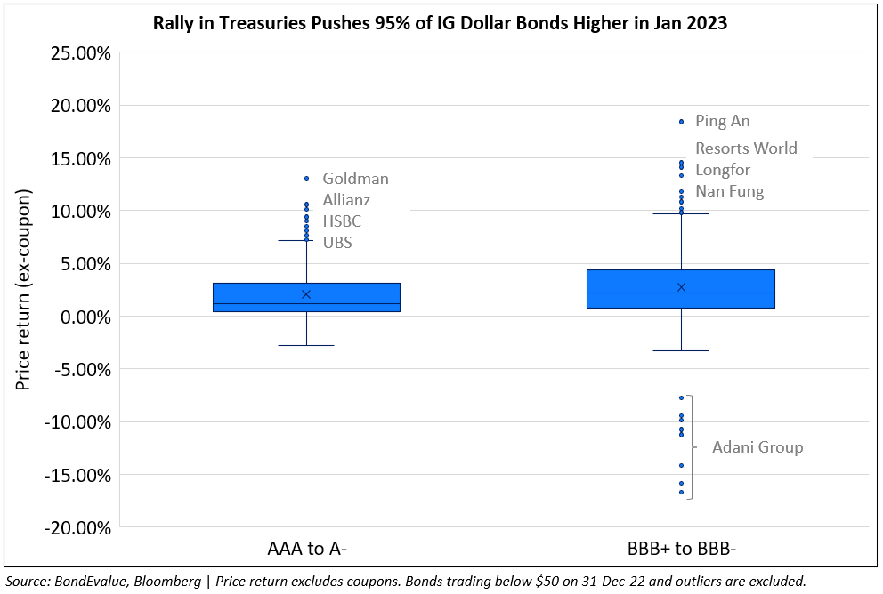 The move lower across benchmark yields especially saw IG bonds outperform due to its greater duration sensitivity. Among the largest gainers in the IG space were bonds of insurance company Ping An and casino operator Resorts World, besides real estate companies like Longfor and Nan Fung. The most notable losses across the IG space were dollar bonds of Adani Group that made headlines after falling by over 15-20% on the back of short-seller Hindenburg Research's report asserting that the group was involved in fraud and stock manipulation.
