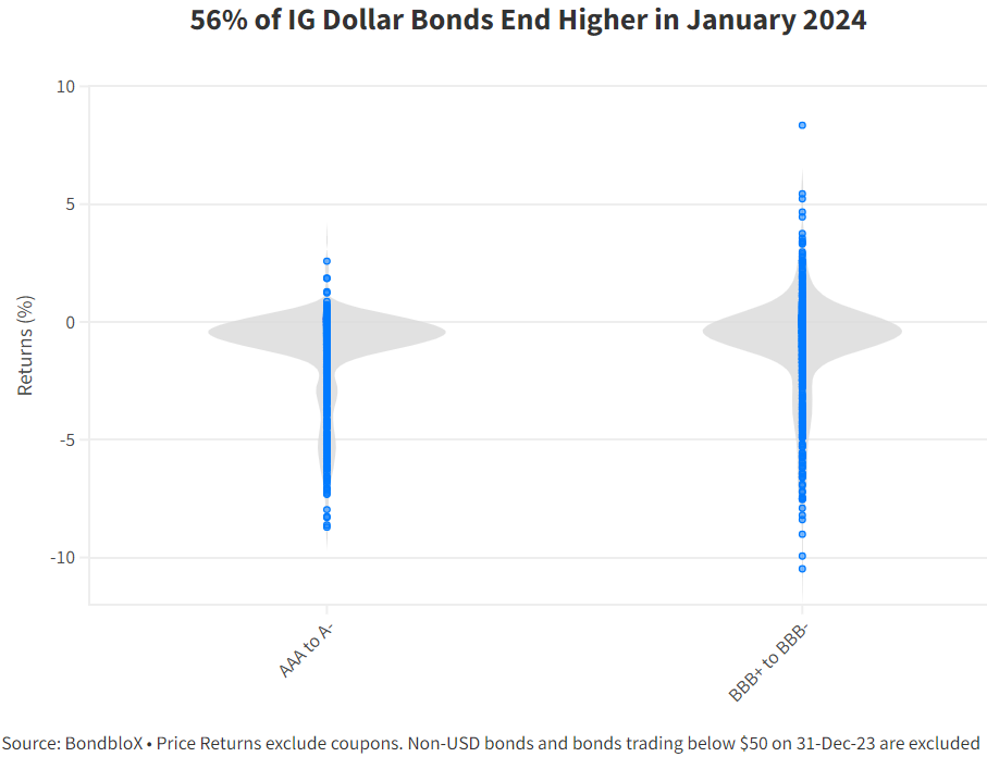 The first month of 2024 was a mixed bag for bond investors with 54% of dollar bonds ending higher. About 56% of IG bonds ended higher and about half of the HY bonds ended higher. This comes after a late rally on the last few days of the month, leading up to and following the FOMC meeting on 30-31 January (scroll for details).