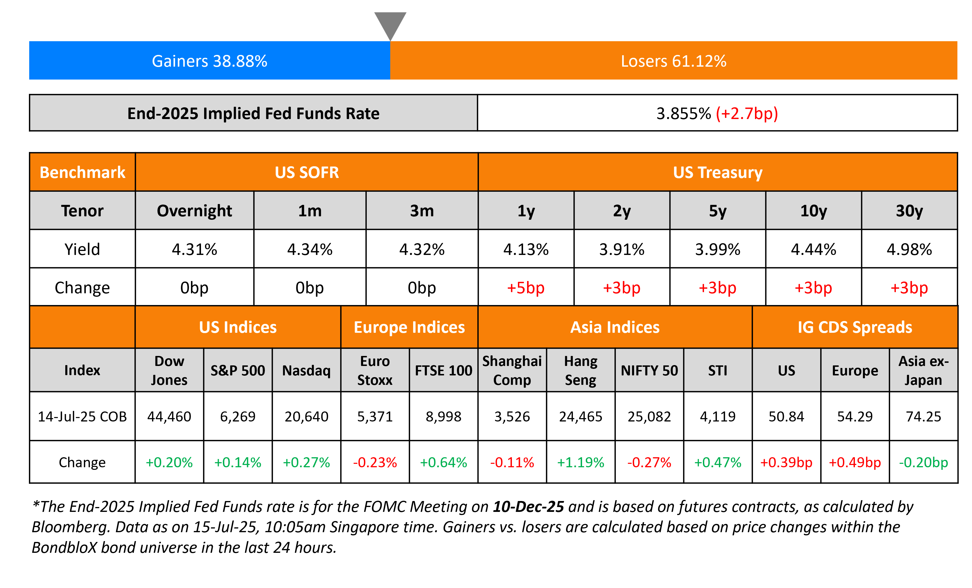 Looking at US equity markets, the S&P and Nasdaq closed higher by 0.1% and 0.3%, respectively. US IG and HY CDS spreads widened by 0.4bp and 1.9bp respectively. European equity markets ended mixed. The iTraxx Main CDS spreads widened by 0.5bp while Crossover CDS spreads widened by 1.1bp. Asian equity markets have opened broadly higher today. Asia ex-Japan CDS spreads were tighter by 0.2bp. Japan’s 10Y government bond yield touched 1.595%, its highest level since 2008. Analysts note that the move comes amid concerns that government spending is likely to increase ahead of an upper house election on July 20.
