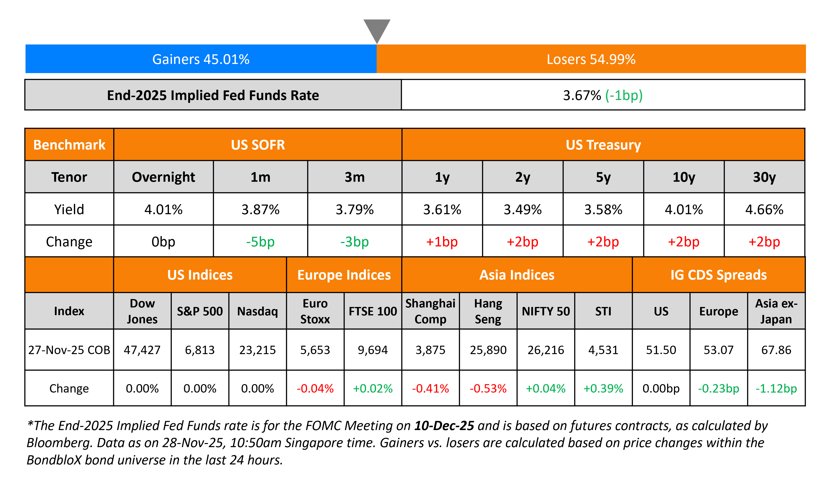 US Treasury yields have ticked higher by 2bp. Due to the Thanksgiving holiday, there were no major macro data points. Besides, US equity and credit markets were also closed. European equity indices were broadly stable. The iTraxx Main CDS and Crossover CDS spreads were 0.2bp and 0.2bp tighter respectively. Asian equity markets have opened mixed this morning. Asia ex-Japan CDS spreads were 1.1bp tighter.