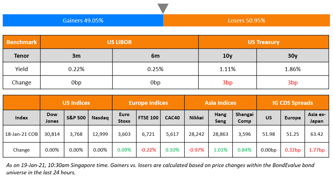 US equity and bond markets were shut for Martin Luther King Day on Monday while European equities traded in a narrow range with DAX up 0.4%, CAC up 0.1% while FTSE fell 0.2%. US 10Y and 30Y Treasury yields are 3bp higher today. Italian PM Giuseppe Conte won a confidence vote in the Chamber of Deputies yesterday and faces a Senate vote today where the government only has a small majority. 10Y Italian BTP yields were up 2bp while German Bund yields were also 2bp higher. EU main and crossover CDS spreads were 0.3bp and 0.1bp wider. China released some upbeat data as GDP rose 6.5% in 4Q2020, beating expectations of a 6.2% rise; industrial production was up 7.3% vs. 6.9% expected although retail sales were up only 4.6% vs 5.5% expected. Asia ex-Japan CDS spreads were 1.8bp wider and Asian equities have opened higher with KOSPI and HK up over 2%, STI up 0.4% while Indonesia is down over 1%.