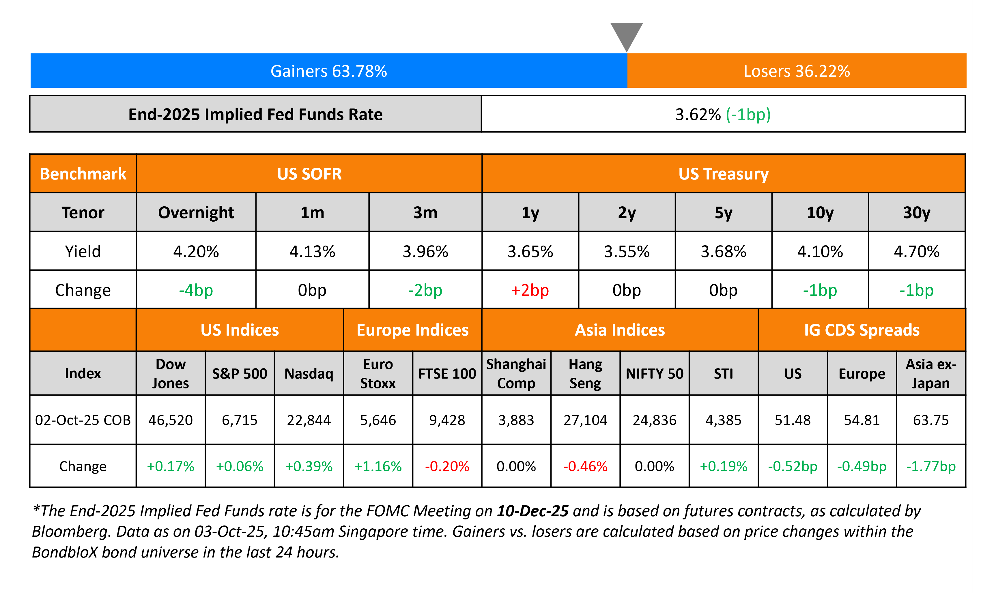 US Treasury yields were broadly unchanged across the curve with a lack of data or any catalysts in the markets. Due to the government shutdown, there will be no NFP release today. US Treasury Secretary Scott Bessent indicated that there could be a “pretty big breakthrough” in the next round of trade talks with China.