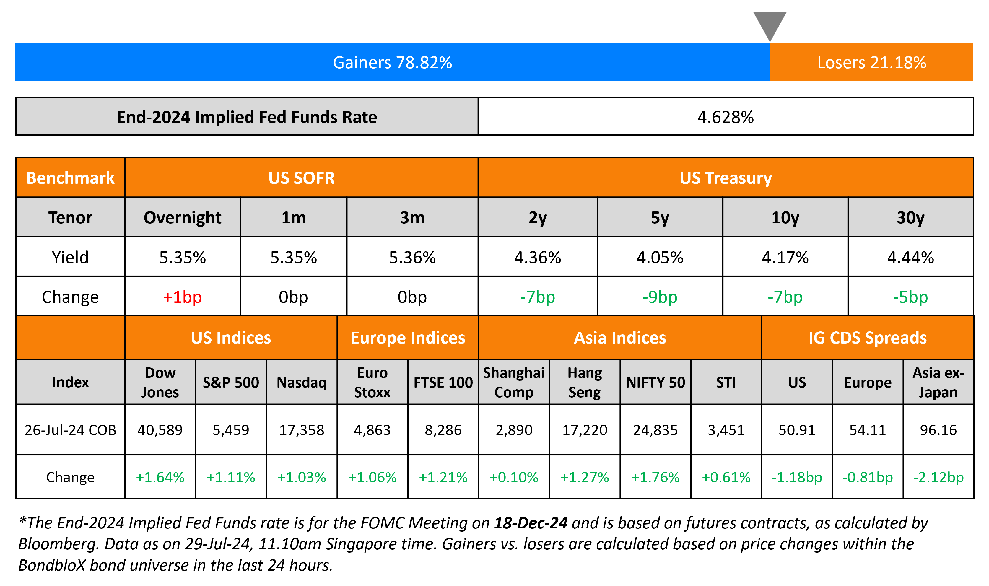 The US Treasury curve moved lower by 7-9bp. US economic data saw the Core PCE YoY come at 2.6% vs. expectations of 2.5%. Separately, the Michigan Consumer Sentiment Index came at 66.4 for July, almost inline with the surveyed 66.5. US equities bounced back on Friday, with the the S&P and Nasdaq up 1-1.1%. US IG and HY CDS spreads tightened by 1.2bp and 4.8bp respectively.