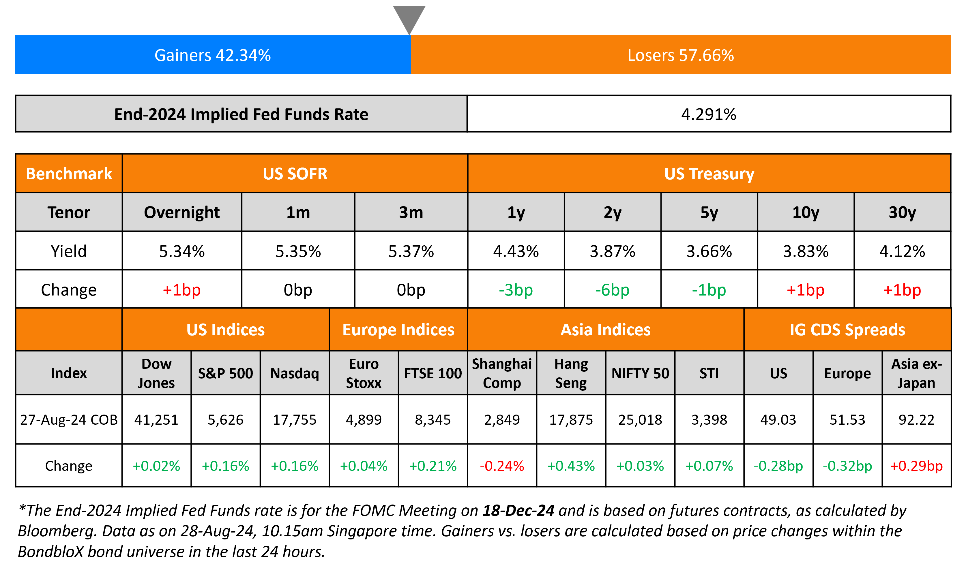 The US Treasury curve bull steepened, with the 2Y yield down 6bp, while yields across longer dated tenors held steady. The 2Y Treasury note auction saw solid demand with a bid-to-cover ratio of 2.68x, with indirect bids at 69%. The US Conference Board Consumer Sentiment Index rose to 103.3 in August vs. expectations of 100.8 and the prior month’s revised 101.9 reading. US IG CDS spreads tightened by 0.3bp and HY CDS spreads tightened by 0.8bp. Looking at US equity indices, the S&P and Nasdaq were up by 0.2% each.