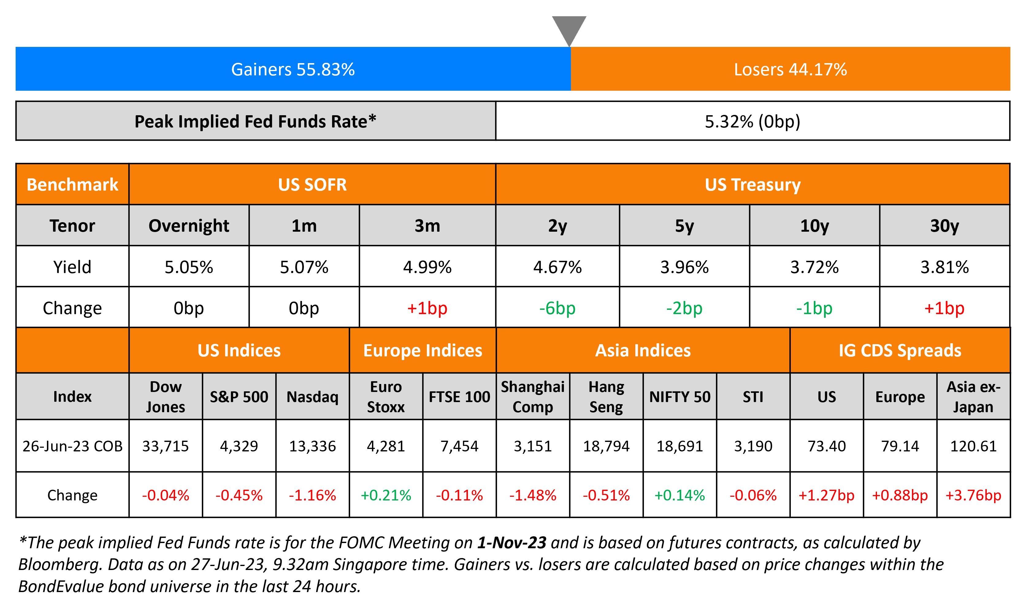 US Treasury yields have broadly steadied after having fallen 5-6bp earlier yesterday following the uncertainty out of Russia over the weekend. Markets continue to price in a 25bp hike in July with a 77% probability and expect them to stay at that level till the end of the year, as per CME probabilities. The peak Fed Funds rate was unchanged at 5.32%. US equity indices ended in the red again, with the S&P and Nasdaq down 0.5% and 1.2% lower respectively. Credit spreads continued to widen with the US IG and HY CDS spreads wider by 1.3bp and 7.9bp respectively.
