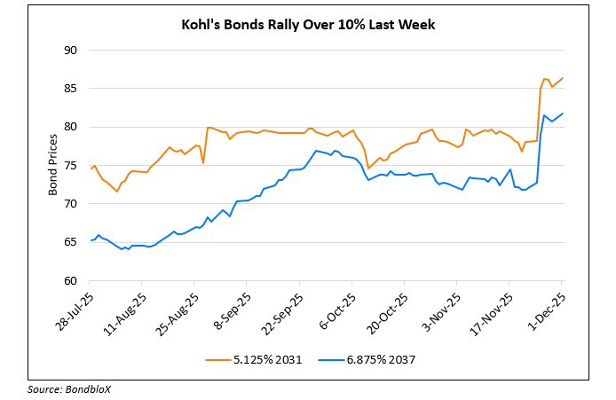 Kohl’s bonds and shares and surged by over 10% and 50% respectively last week, after the department store projected a smaller full-year sales decline and a significantly higher annual profit forecast. This marks the second raise in its forecast this year with analysts noting that it signals the early success of its turnaround strategy under Michael Bender, who was recently named CEO. The company now expects adjusted EPS between $1.25-1.45 for the fiscal year 2025, up from a prior range of $0.50-0.80. The annual sales decline is projected to be 3.5-4.0%, a significant improvement from the previously estimated 5-6% decrease. In Q3, Kohl’s posted an adjusted profit of $0.10/share, beating estimates of a $0.20/share loss. Besides, it also reported sales of $3.41bn which topped estimates. The results and stability is said to be driven by cost cuts and strategic moves to attract value shoppers, including adding more coupon-eligible products, investing in proprietary brands, and expanding its Sephora partnership with trendy new brands to appeal to younger customers.