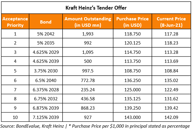 Kraft Heinz announced a bond buyback (Term of the day, explained below) of bonds worth $2.8bn, launching a tender offer to repurchase 10 outstanding bonds. The buyback is part of its efforts to reduce its debt load post its $3bn sale of Planters to Hormel. This is their second debt buyback after a $1bn transaction in March. The $2.8bn buyback includes principal and premium in its purchase price, but does not include accrued and unpaid interest. Below are the details of their tender offer: