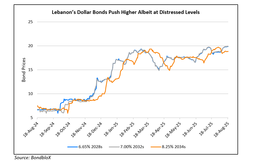 Lebanon dollar bonds have recovered sharply (~4x) from their all-time lows in 2024, albeit still at distressed levels of ~20 cents on the dollar, as seen in the chart above
