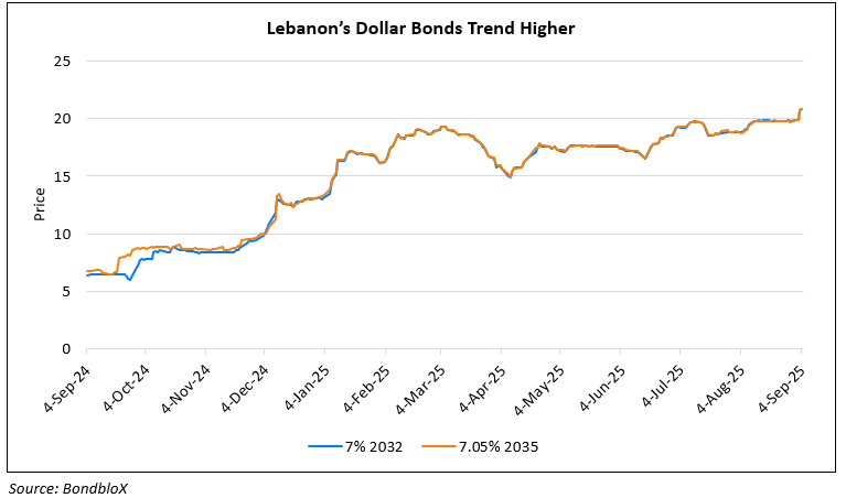 Lebanon’s defaulted dollar bonds have climbed above 20 cents on the dollar for the first time in five years. Analysts have highlighted that investor optimism regarding political and economic reforms are gaining traction. The rally follows the formation of a functional government and pledges by new leadership, to tackle an $80bn banking hole and pursue restructuring. Creditors, including BlackRock, Amundi, and Aberdeen, are pushing for a deal, but progress hinges on IMF support, regional funding, and resolving Lebanon’s banking and political crises. Gulf states have tied financial aid to reforms, anti-corruption efforts, and demilitarization. While these conditions remain unresolved, early signs of economic recovery, such as an uptick in PMI and central bank efforts to stabilize banks, have buoyed sentiment, reports suggest. Lebanon was upgraded to CCC last month by S&P. According to Bloomberg, Lebanon’s 2035 bonds have given a 250% total return since September 2023, outperforming all other emerging-market debt, despite no payments since 2020.