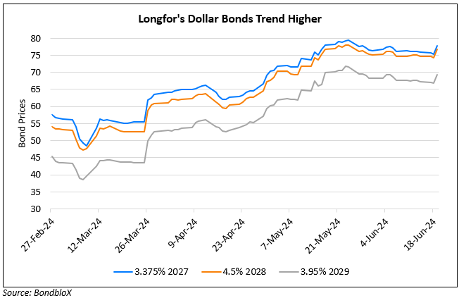 Chinese property developer Longfor Group’s dollar bonds jumped higher by over 2 points across the curve. While the exact reason behind the move was not known, the company successfully passed all resolutions during its annual general meeting (AGM), including declaration of a final dividend of RMB 0.23/share ($0.032), re-electing directors and granting mandates for share issuance and repurchases. The developer’s dollar bonds have been trending higher since March following easing regulations from China, whilst also boosting market sentiment by setting aside funds to repay an RMB 1.5bn ($208mn) note that matured in May.