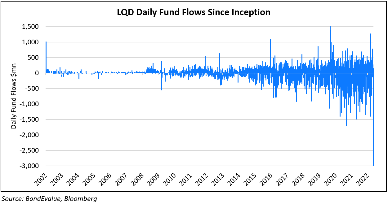 The largest corporate bond ETF, the iShares iBoxx USD investment grade corporate bond ETF (LQD) witnessed record daily outflow of $3bn on Monday, as per Bloomberg data. This is the largest daily outflow since inception in 2002. This underscores the reversal in sentiment, following six consecutive weeks of inflows.