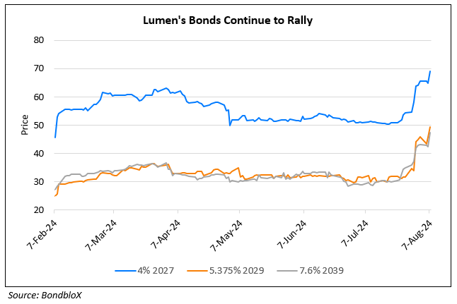 Lumen Technologies jumped higher by 3-5 points across the curve, continuing their rally from the previous week. The company reported its second quarter earnings yesterday, wherein the company said that $5bn of new business was driven by AI demand and it was in talks for further $7bn in potential sales. Lumen also raised its free cash flow forecast for the year to $1-1.2bn from the earlier $100-300mn. Lumen’s stock and bonds have been trending higher since it announced a partnership with Microsoft last month. Its stock closed 93% higher on Tuesday to trade at $5, witnessing the biggest jump on record since February 2023. Lumen’s bonds have seen a massive rally with some bonds gaining by 18-19 points over the last 2 weeks as shown in the chart