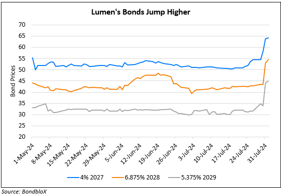 Lumen’s bonds have risen over 8-10 points this week. The company recently announced its partnership with Microsoft. Lumen said that it will use Microsoft’s Cloud to drive its digital transformation leading to reduction in its overall technology costs, removal of legacy systems and creating new solutions for its global customer base. More recently, Corning announced that it’s selling 10% of its fiber capacity for the next two years to Lumen to help the latter build of a new network to interconnect AI-enabled data centers. The stream of positive updates have seen its shares soar by nearly 190% in July. Its bonds have jumped higher in this period too, as seen in the chart.