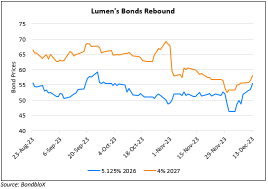 Lumen Technologies’ bonds staged a slight recovery after jumping 2.5-3.5 points higher across the curve. While there was no update available yet regarding the rally in its bonds, the company earlier last month saw its creditors agree to provide $1.2bn of financing via new long-term debt, helping extend its maturities, alongside covenant modifications. Its bonds have held steady since then, came after witnessing downgrades by rating agencies through the year with the most recent action to CCC- from B- by Fitch.