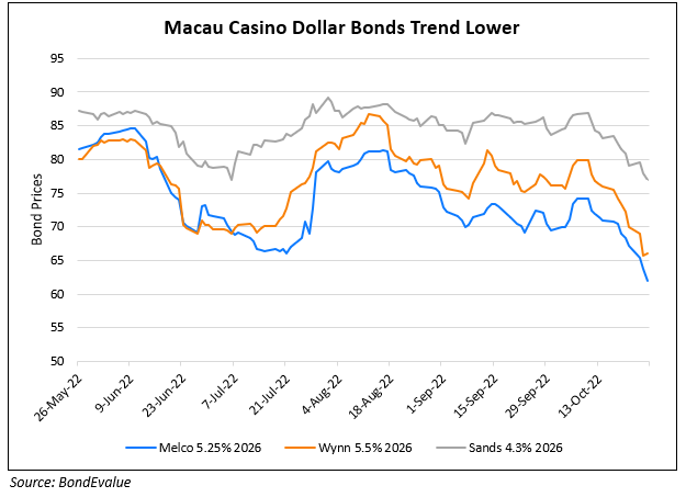 Dollar bonds of Macau’s casino operators trended lower with reports noting that Xi Jinping winning his third term as leader of China’s Communist Party may put further pressure on casino operators. Pitchbook news notes that Xi appointed the architect of the lockdown program, Li Qiang to the number two position in the Standing Committee. Fears are that the shakeup in office may lead to possible reversal of its stance to ease Covid-related restrictions which can affect tourism to Macau.