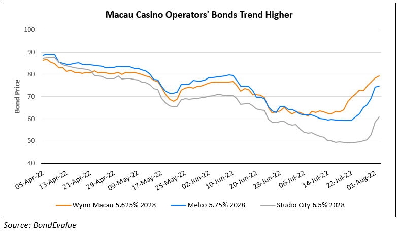 Bonds of Macau’s casino operators have risen with Studio City’s and Melco Resorts’ bonds leading the pack. This follows the decision to ease Covid-related restrictions in Macau, in force from today. This news arrives as Macau’s casinos experienced their worst ever month on record with gross gaming revenues falling 95% to $49mn, according to the Gaming Inspection & Coordination Bureau (vs. analyst expectations of a 97% fall). The decline has seen Macau lose its spot as the top gambling hub to Las Vegas thanks to China’s zero-covid policy in the region.
