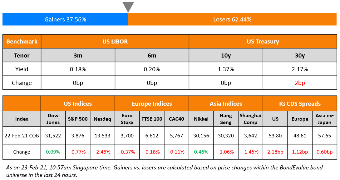 S&P ended 0.8% lower while Nasdaq saw a sharp fall of 2.5%. Tesla fell 8.5% while Apple, Amazon, Microsoft and other tech stocks were down ~3%. US 10Y Treasury yields were stable despite the negative sentiment in equity markets. Fed Chair Powell is due to appear before the Senate Banking Committee later today for his semi-annual testimony. European equities were also lower ~0.5% and German Bund yields dipped 4bp. US IG CDS spreads were 2.2bp wider and HY was 8bp wider. EU main CDS spreads widened 2.2bp and crossover spreads widened 4.4bp. Asian equity markets have opened flat while Asia ex-Japan CDS spreads are 0.6bp wider.