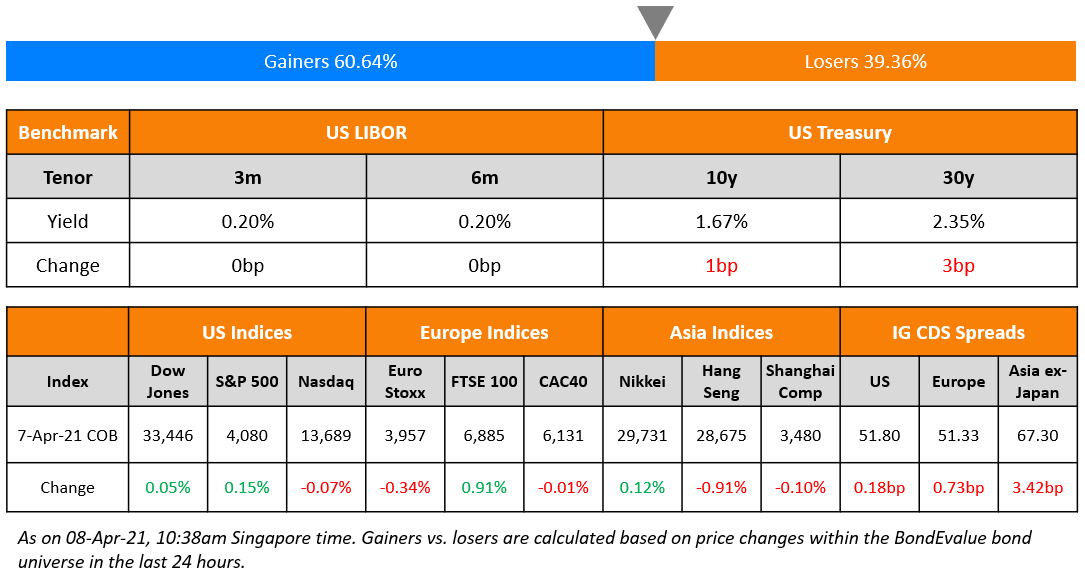 Both S&P and Nasdaq ended almost flat while US 10Y yields gained 1bp to 1.67%. Focus now shifts to the upcoming earnings season to get an idea on how corporate America stands. The Fed’s March meeting minutes indicated a dovish tone similar to their meeting last month. In Europe, the DAX and CAC were marginally lower while FTSE rallied 0.9% adding to yesterday’s gains. US IG CDS spreads were 0.2bp wider and HY was 0.5bp tighter. Looking at the Bloomberg-Barclays US High Yield index, spreads measured by the Option Adjusted Spreads (OAS) are currently at a 14Y lows last seen only in 2007 before the global financial crisis.