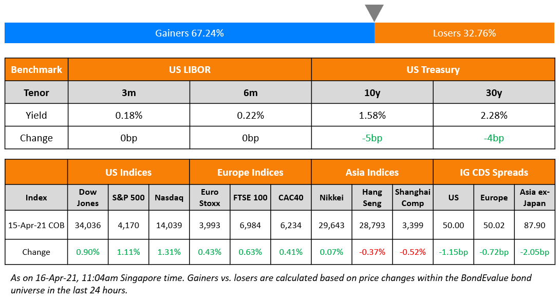 Equities rallied again with S&P up 1.1% and Nasdaq up 1.3%. US macro data surprised to the upside – retail sales in March exploded 9.8% higher, the highest in 10 months and jobless claims for the prior week fell 193k to 576k. Despite the strong macro data, US 10Y yields tumbled 8bp to 1.55%, its lowest in over a month. European equities also gained with the FTSE, DAX and CAC up 0.6%, 0.3% and 0.4%. US IG CDS spreads were 1.2bp tighter and HY was 6.5bp tighter. EU main CDS spreads were 0.7bp tighter and crossover spreads tightened 3bp. China’s GDP grew by a record 18.3% YoY in Q1 2021 – fixed asset investments rose 25.6% and industrial production grew 24.5%. Asian equity markets are mixed today and Asia ex-Japan CDS spreads are 6bp wider.