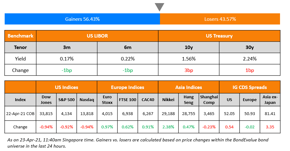 S&P and Nasdaq fell over 0.9% as equities were lower again. Market sentiment was down as US President Joe Biden eyed a tax rate as high as 43.4%, in a proposal to tax the rich as per Bloomberg. US weekly initial jobless claims dropped 39k to a 13-month low of 547k. US10Y yields were 3bp higher at 1.56%. European equities were stronger with DAX up 0.8%, CAC and FTSE up 0.6% and 0.9% respectively. The ECB kept its policy unchanged during its monetary policy meeting yesterday. US IG CDS spreads were 0.5bp tighter and HY was 1.1bp wider. EU main CDS spreads were flat and crossover spreads widened 0.4bp. Asian equity markets are 0.7% higher today after Wall Street’s losses yesterday and Asia ex-Japan CDS spreads have widened 3.3bp.