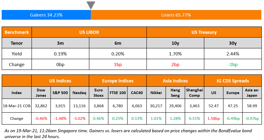 US equities fell yesterday with the S&P down 1.5% while the tech heavy Nasdaq slipped over 3%. Apple, Amazon and Netflix fell over 3.4%. The only sector in the green was financials, up 0.6%. The fall in equities came after the 10Y Treasury yield shot to 1.75% and then pulled back to 1.70%. US Philly Fed Manufacturing Index printed at a massive 51.8 vs. a forecast of 23, its highest level in almost 48 years while US jobless claims for the prior week was up 45k to 770k vs. the 700k forecast. European equities ended higher with the DAX up 1.2% while the FTSE and CAC were up 0.3% and 0.1%. US IG CDS spreads were 1.6bp wider and HY was 12bp wider. EU main CDS spreads were 0.5bp tighter and crossover spreads tightened 1.6bp. Asian equity markets have opened lower ~1% and Asia ex-Japan CDS spreads are tighter 1bp.