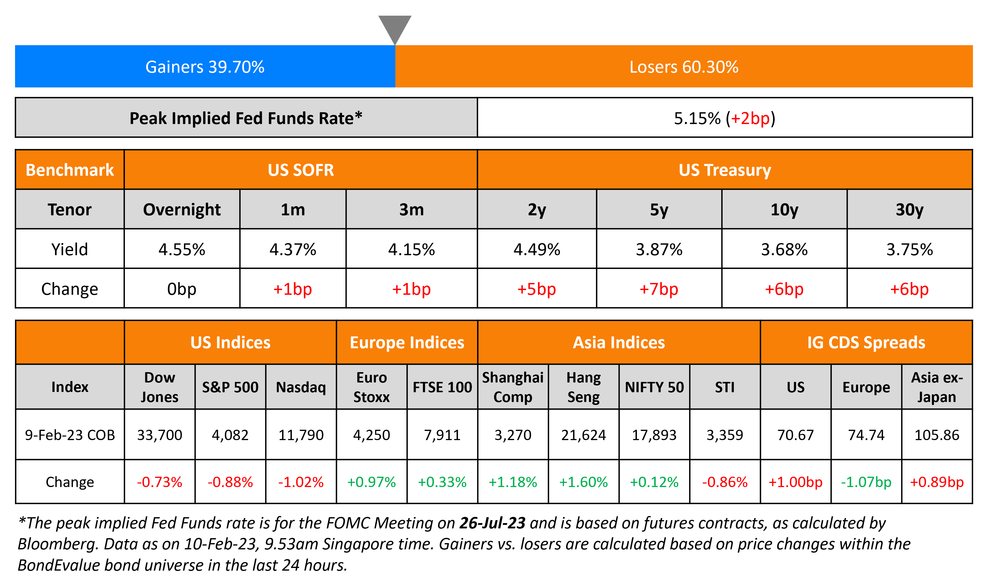 US Treasuries yields were broadly higher by 5-7bp across the curve. The peak Fed funds rate widened 2bp to 5.15% for the July 2023 meeting. While a 25bp hike at next month’s FOMC meeting is all but certain (91% probability), the likelihood of another 25bp hike at the May meeting stands at 71%, up from 30% a week ago. Markets keenly await the CPI inflation report next week on February 14 with estimates of a 6.2% print. US IG CDS spreads widened by 1bp while HY spreads were 6.6bp wider. Equity indices were higher with the S&P and Nasdaq down 0.9% and 1% respectively.