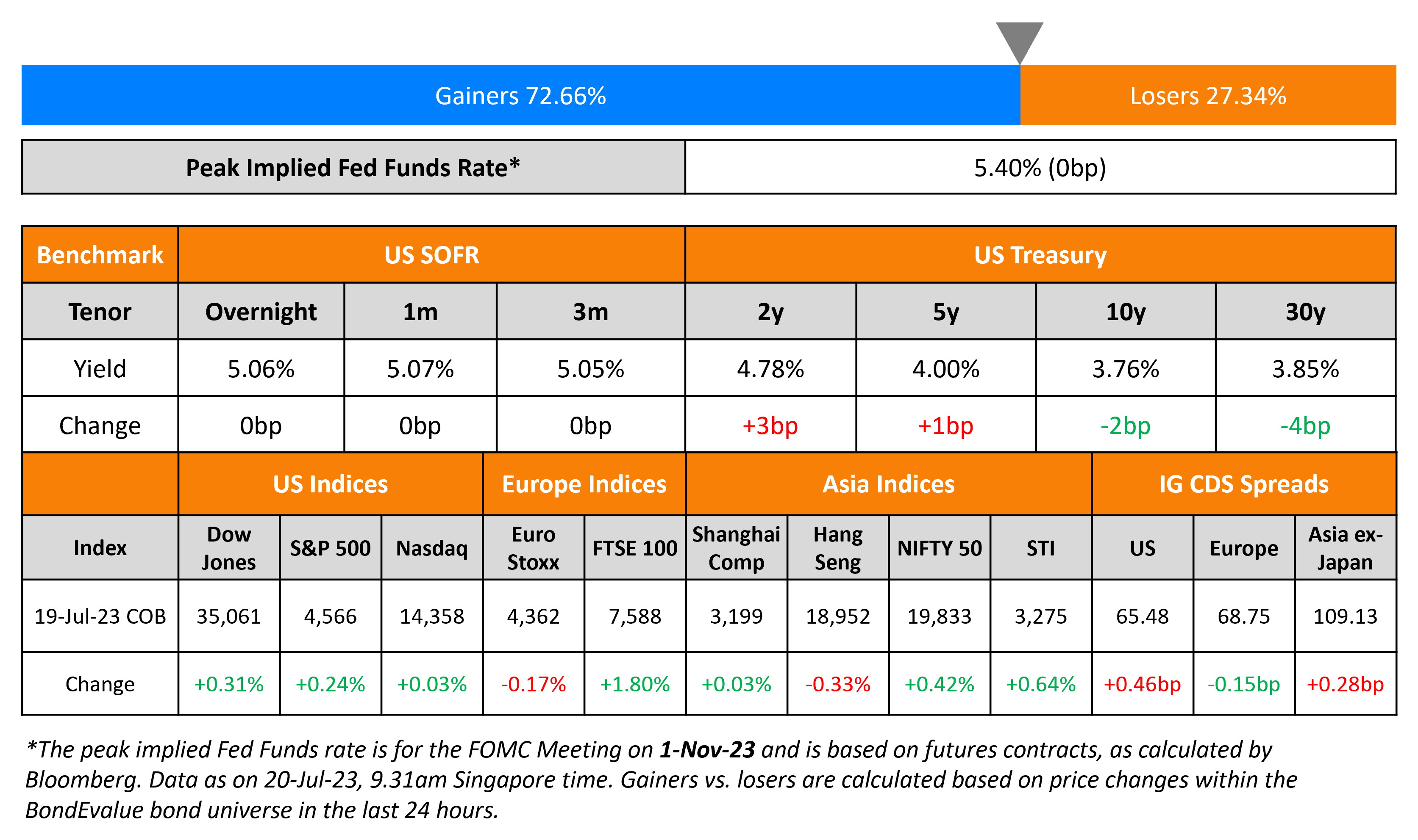 Treasury yields were trading steady on Wednesday. The peak Fed Funds rate was unchanged at 5.40%. The beginning of the US earnings season saw big banks continue to report earnings with Goldman Sachs disappointing expectations as profits fell by ~60%. On the other hand, BofA beat street expectations with net income up 19%. US equity indices ticked slightly higher. Credit spreads widened slightly with US IG and HY CDS spreads wider by 0.5bp and 0.2bp respectively.