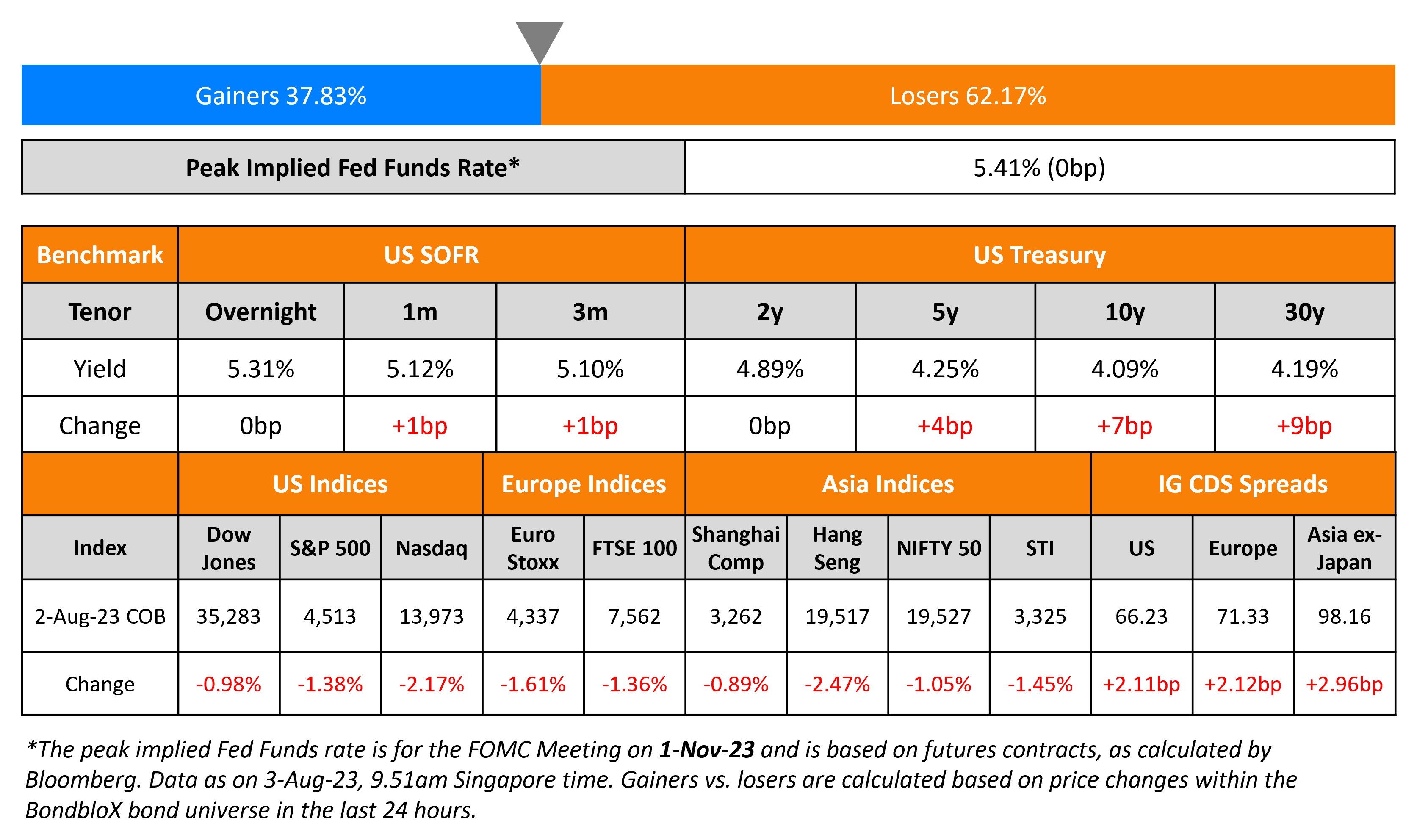 Treasury yields jumped higher as the curve continued to bear steepen – 2Y yields were flat while 10Y and 30Y yields were up 7-9bp. The 10Y yield touched 4.09%, the highest level since November 2022. The US Treasury announced it will sell $103bn of securities across 3Y, 10Y and 30Y maturities in Q3, higher than the $96bn sale last quarter, leading to a larger supply of Treasuries, which pushed yields higher. The ADP report released yesterday showed that US private payrolls increased 324k in July, much higher than forecasts of 189k, though lower than June’s 455k print, pointing towards a strong resilient labor market.