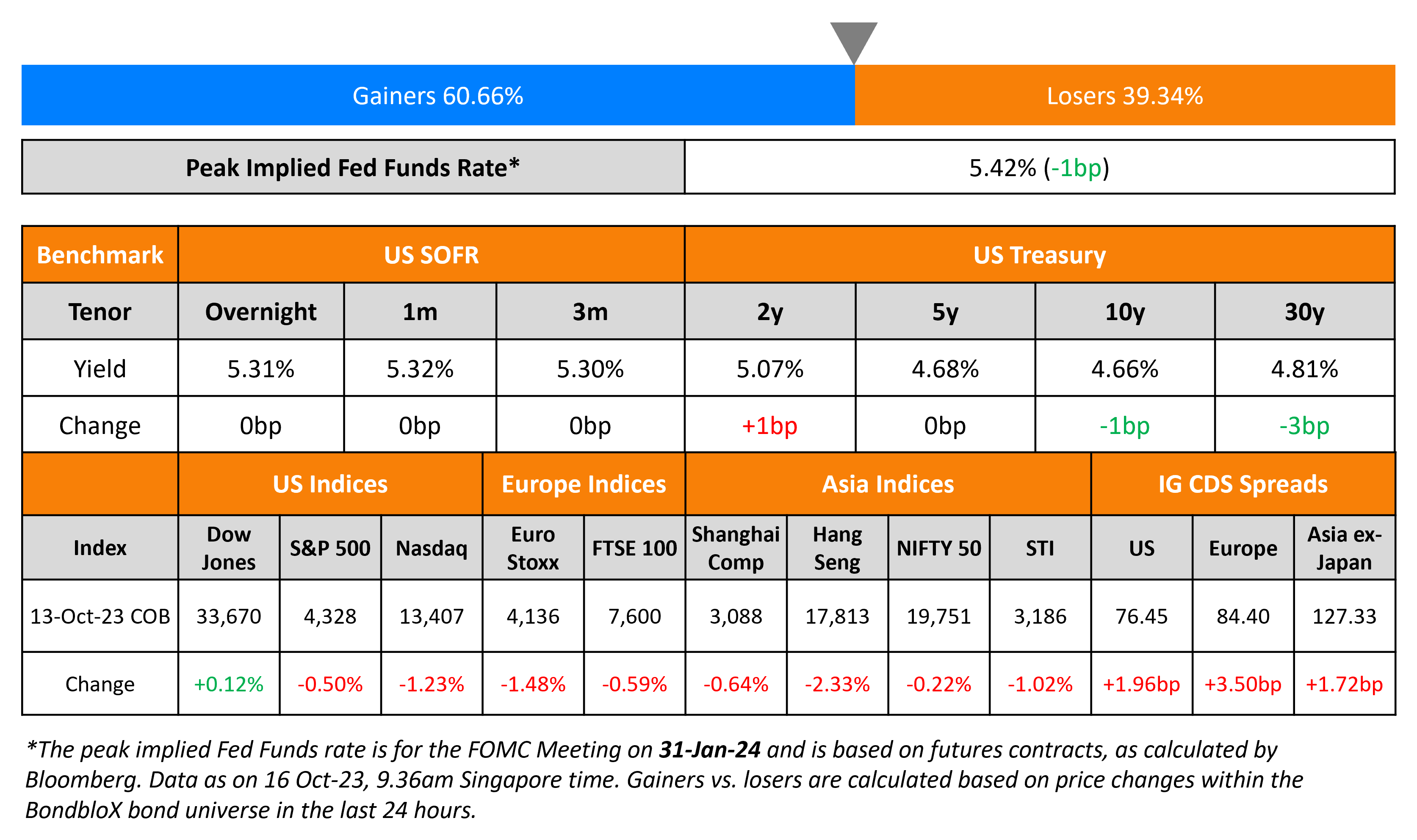 US Treasury yields were flat on Friday after a volatile week, impacted by the Israel-Hamas war. The consumer sentiment index slid more than 5 points in October to 63, the sharpest monthly decline since June 2022 with forecasts at 67. Philadelphia Fed President Patrick Harker, a voting member said that disinflation was underway and reiterated favoring holding interest rates where they are, barring a sharp change in data. US credit markets saw IG CDS spreads widening 2bp and HY spreads wider by 9bp. US equities moved lower with the S&P down 0.5% and the Nasdaq falling 1.2%.