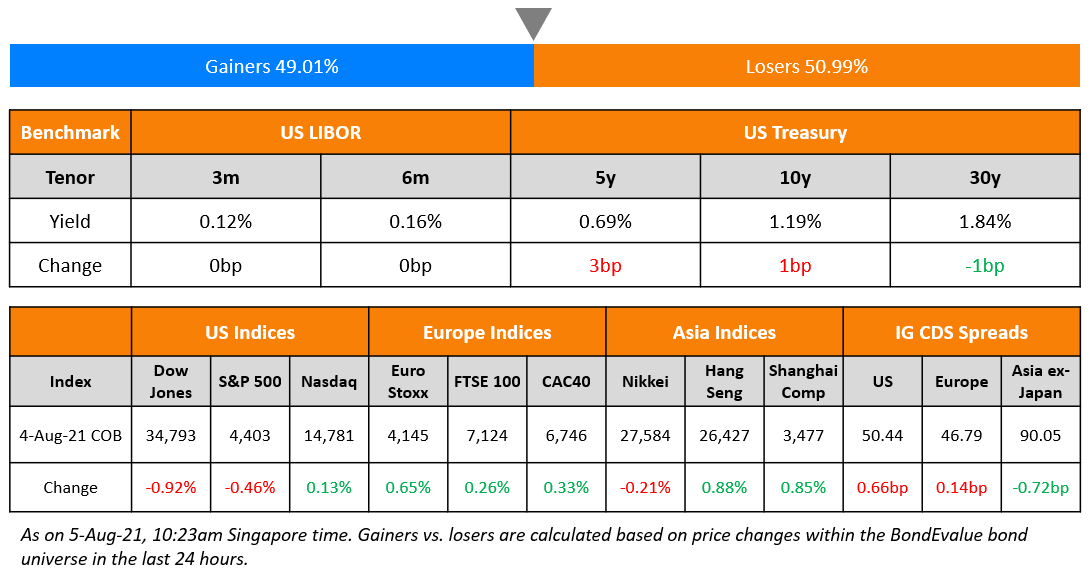 ADP private payroll data posted an increase of 330k in private-sector jobs in July, against an estimate of 653k. IHS Markit Brazil Services Business Activity Index highlighted a second successive increase in output with a reading of 54.4 in July, up from 53.9 in June. It’s central bank raised interest rates by 100bp – the most since 2003, in an effort to contain rising inflation. Singapore’s PMI came in at 56.7 in July vs. 50.1 in June, indicating strong private sector growth. UAE’s PMI rose from 52.2 in June to 54.0 in July, pointing to a strong improvement in business conditions and growth in the non-oil economy, the highest in two years. Saudi Arabia PMI fell for the first time in four months to 55.8 in July, from 56.4 in June.