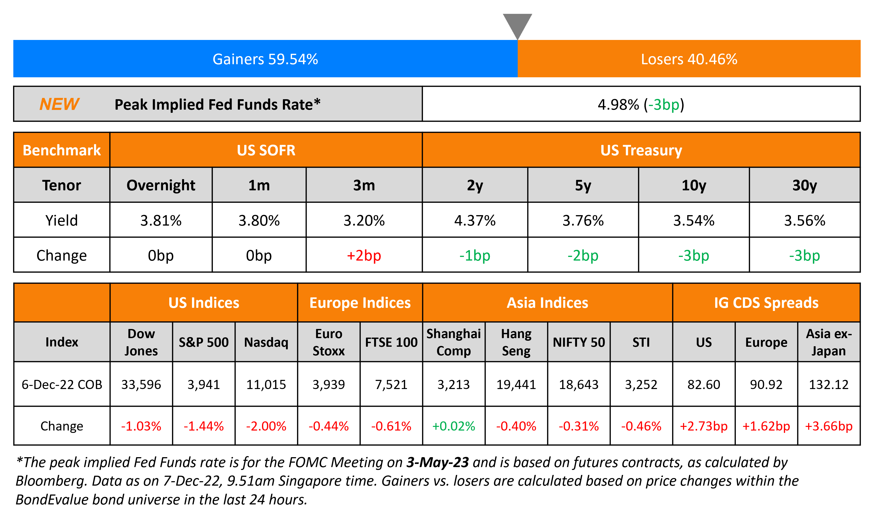 US Treasury yields eased by~2bp across the curve with the peak Fed Funds rate also easing by 3bp to 4.97% for the May 2023 meeting. This follows a 5-8bp move higher across the benchmark curve after a stronger-than-expected ISM report. The probability of a 50bp hike at the FOMC’s December meeting remained unchanged at 77%. US IG and HY CDS spreads widened 2.7bp and 16.2bp respectively. US equity markets ended lower with S&P down 1.4% and Nasdaq down 2%.