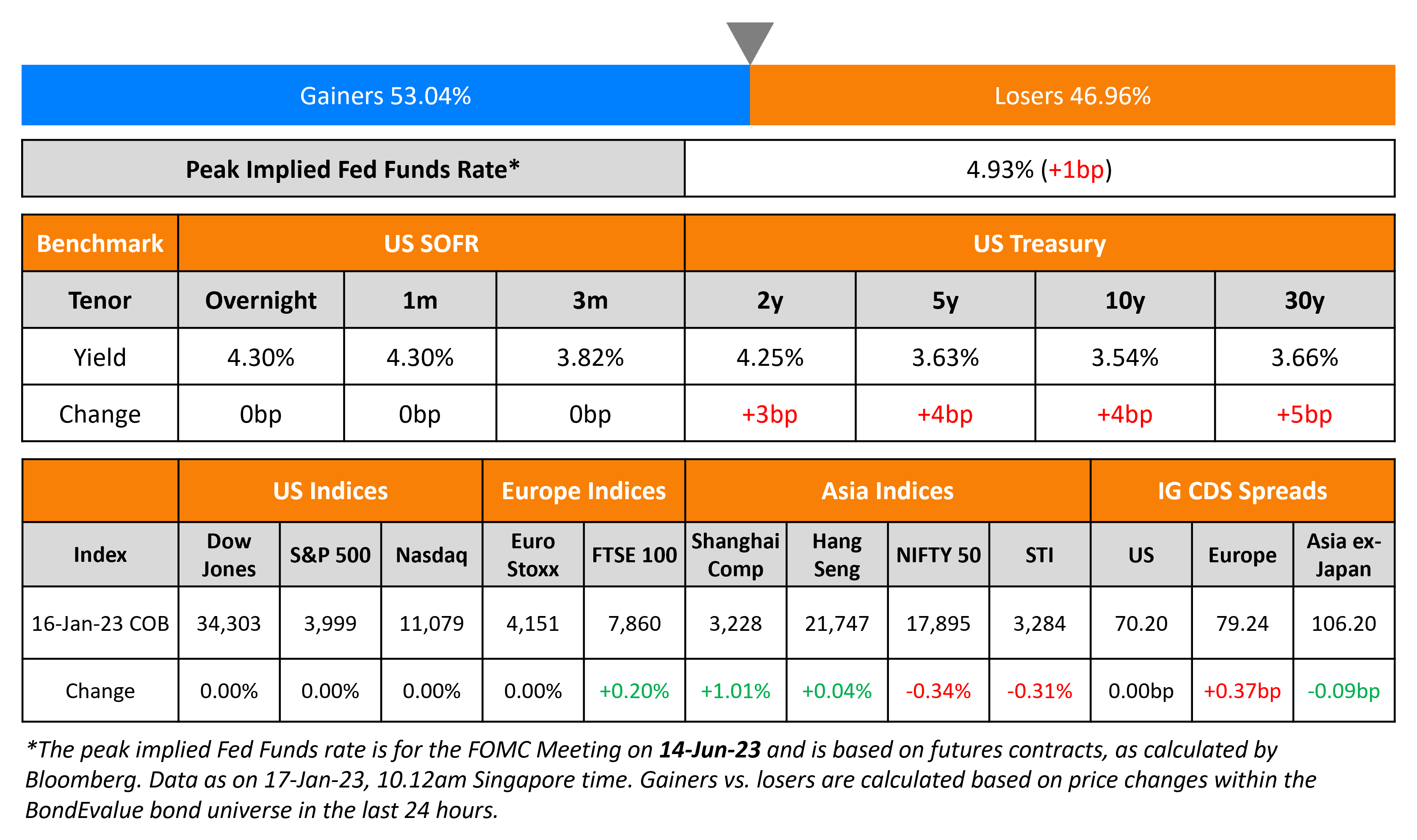 US Treasury yields moved higher by 3-5bp across the curve. The peak Fed funds rate was 1bp higher at 4.93% for the June 2023 meeting. The probability of a 25bp hike at the FOMC’s February 2023 meeting stands at 91%, almost unchanged. US equity markets ended were closed on account of Martin Luther King Day. US CDS markets were also shut.