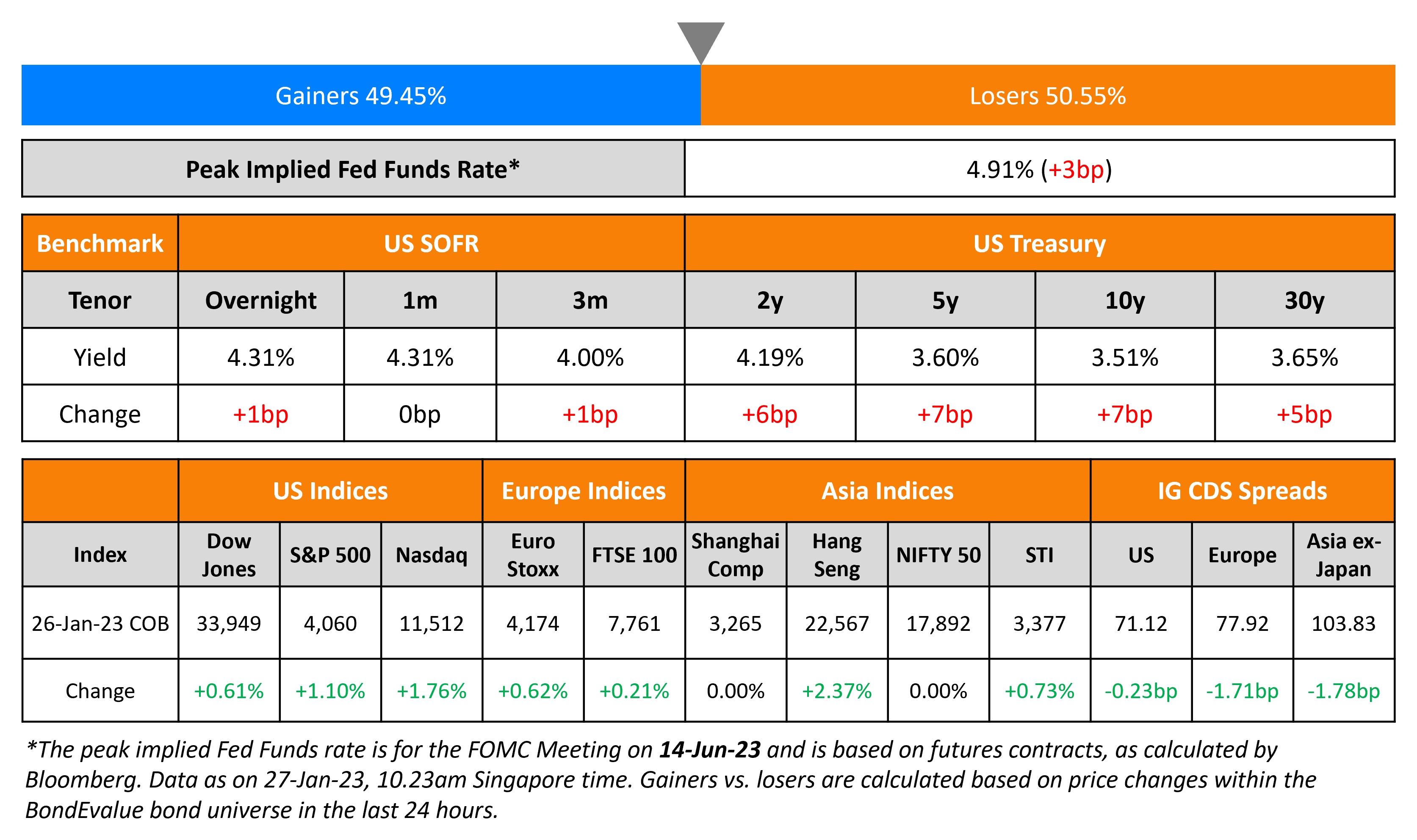 US Treasury yields jumped higher by 5-7bp across the curve on Thursday. The peak Fed funds rate was 3bp higher at 4.91% for the June 2023 meeting. The probability of a 25bp hike at the FOMC’s February 2023 meeting stands at 98%. US Q4 GDP grew at an annualized rate of 2.9% vs expectations of a 2.6% rise. This follows a 3.2% growth recorded in Q3. US durable goods orders jumped 5.6% in December vs. forecasts of a 2.4% rise. This was led by a surge in new contracts for Boeing passenger planes. Ex-transportation, new orders fell 0.1%. US equity markets ended higher with the S&P and Nasdaq up 1.1% and 1.8%. US IG CDS spreads tightened by 0.2bp while HY spreads were 2.8bp tighter.