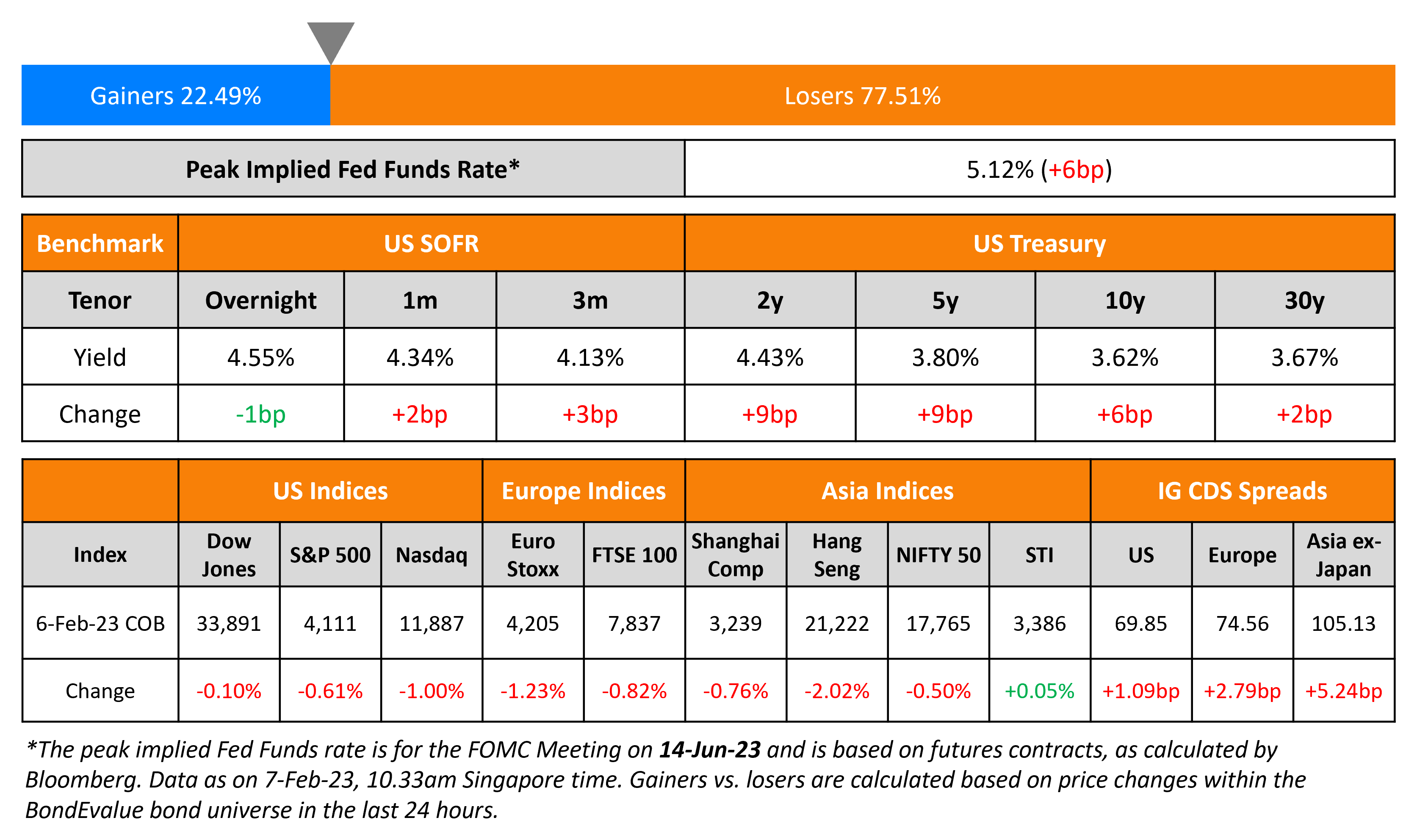 Bond markets sold-off further on Monday with benchmark yields higher by 6-9bp across the curve, continuing the climb post the strong jobs report. The peak Fed funds rate rose 6bp to 5.12% for the June 2023 meeting. Currently, the probability of a 25bp hike at the FOMC’s March meeting stands at 97%. All eyes are now on Fed chair Powell, who will be speaking at the Economic Club later today, for clues on the future path of interest rates. US IG CDS spreads widened by 1.1bp while HY spreads were 7.1bp wider. Equity indices moved lower along with bonds on Friday with the S&P and Nasdaq down 0.6% and 1% respectively on Monday.