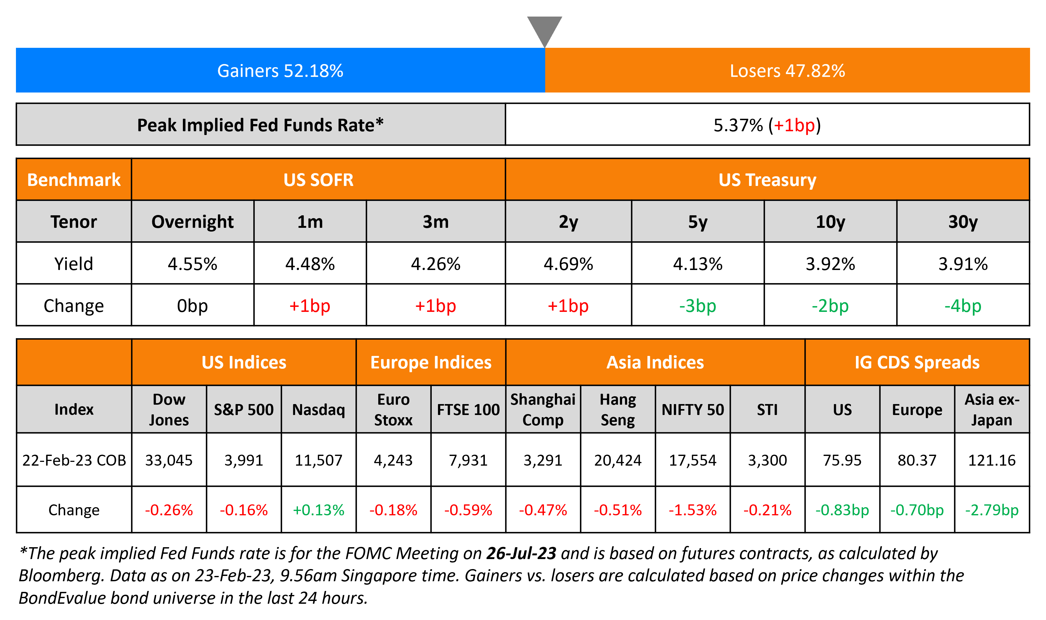 US Treasury yields eased 2-4bp across the mid-to-long end of the curve with the peak Fed funds rate inching 1bp to 5.37% for the July 2023 meeting. The FOMC’s February meeting minutes came out yesterday with members referring inflation risks as a “key” to policy. Interestingly, “a few” participants favored a larger 50bp increase at the meeting, or said they “could have supported” it. However, the minutes did little to impact bond markets overall. Markets continue to price in a 24% chance of a 50bp hike in March vs. 9% a week ago. Going by the maximum probabilities, markets are pricing in 25bp hikes at each of the next three Fed meetings in March, May and June. US IG and HY CDS tightened by 0.8bp and 5.3bp. The S&P and Nasdaq closed ended the day mixed, with the former down by 0.1% and the latter up by 0.1% on Wednesday.