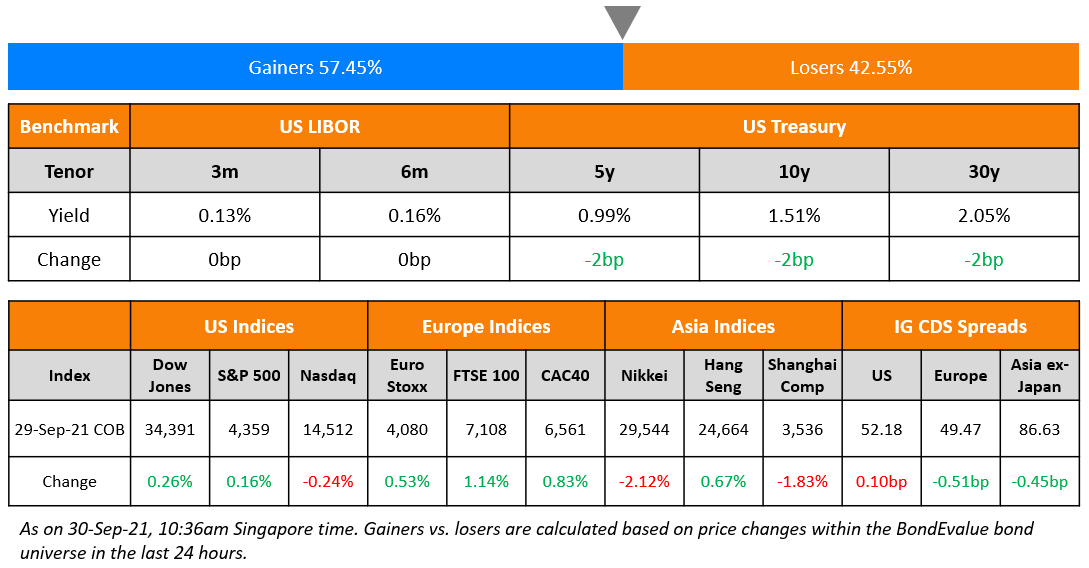 Arab Petroleum Investments Corp (Apicorp) raised $750mn via a 5Y green bond at a yield of 1.1483%, 10bp inside initial guidance of MS+50bp area. The bonds have expected ratings of Aa2/AA (Moody’s/Fitch), and received orders over $2.1bn, 2.8x issue size. The bonds will be used to finance, refinance or invest in projects linked to Apicorp’s green finance framework, including green buildings, renewable energy and pollution prevention and control. The new bonds are priced 11.2bp tighter to its existing 1.26% non-green 2026s that yield 1.26%.