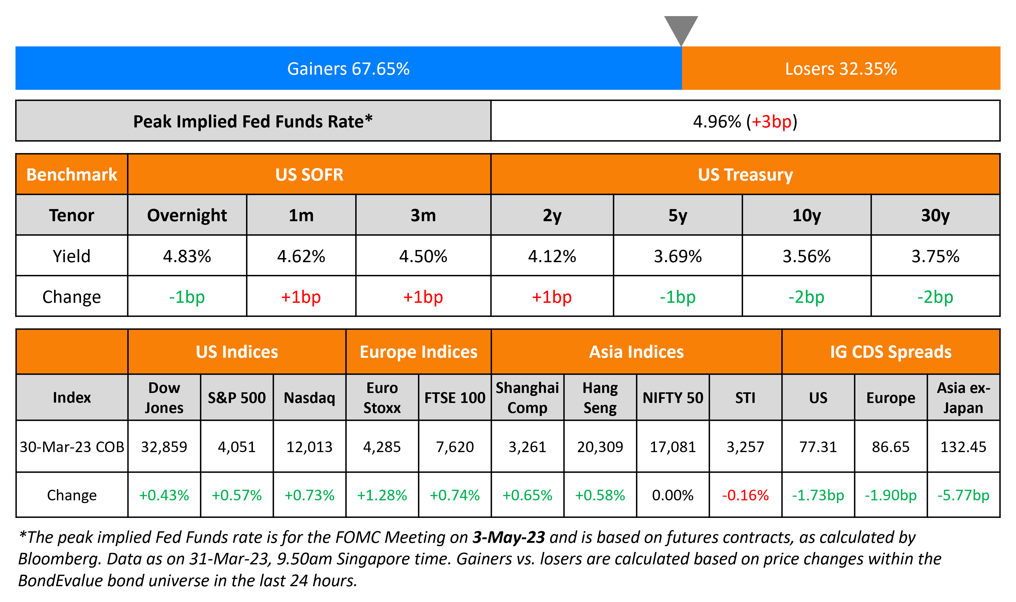 US Treasury yields were largely flat yesterday across the curve and the peak fed funds rate moved 3bp higher to 4.96% for the May meeting. CME maximum probabilities are now slightly skewed towards a 52% probability of a 25bp rate hike in May vs. a 40% chance a day earlier. The probabilities are almost evenly poised for either a status quo or a 25bp rate cut in the subsequent meetings thus offering no clarity of the path of policy interest rates. US IG and HY CDS spreads tightened 1.7bp and 9.2bp respectively as the broad risk-off sentiment eased. The S&P and Nasdaq ended higher on Thursday, up by over 0.6% and 0.7% respectively.