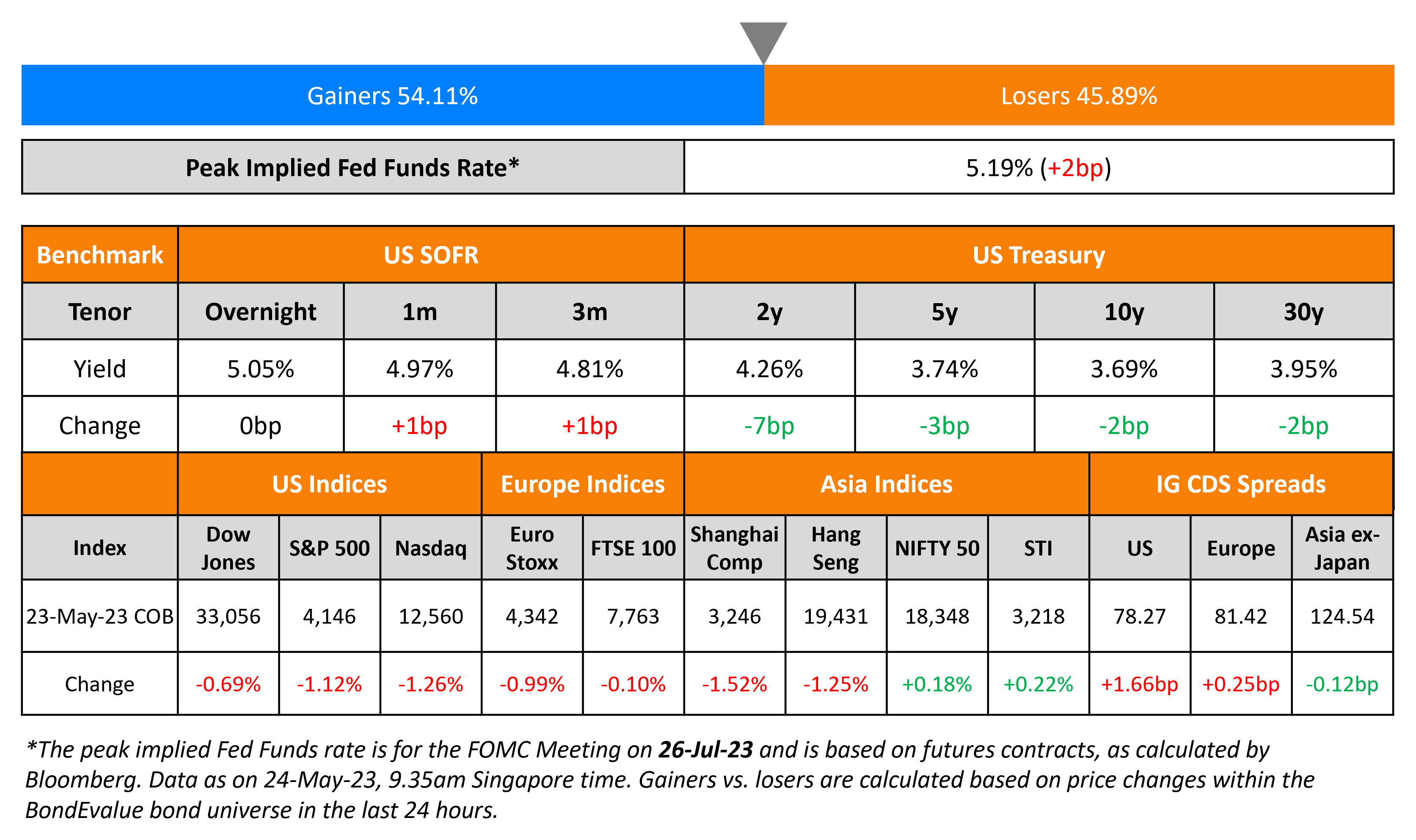 The peak Fed Funds Rate moved 2bp higher to 5.19% with markets now expecting a 69% chance of a status quo at the Fed’s next meeting in June, thereby implying a 31% chance of a 25bp hike. Equity indices were closed lower with the S&P and Nasdaq down 1.1-1.3%. US IG CDS spreads widened by 1.7bp and HY CDS spreads widened by 7.8bp.
