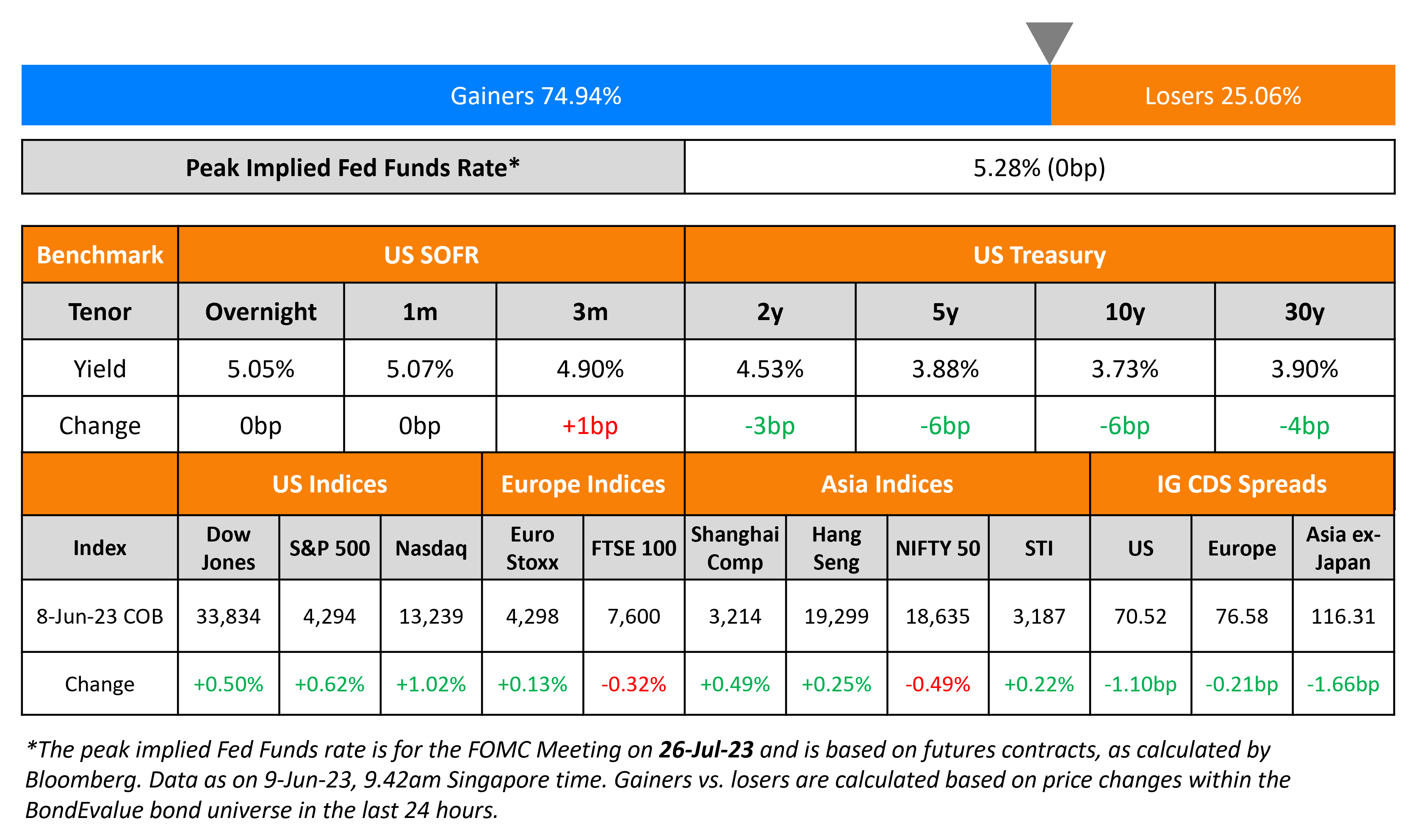 US Treasury yields moved lower on Thursday following the weekly jobs data with the 5Y and 10Y yields down 6bp each. Initial jobless claims for the prior week jumped 28k to 261k, the highest level since October 2021, and well above the 235k forecast. Expectations continue for a status quo at the 13-14 June FOMC meeting while markets are pricing-in a 66% probability of a 25-50bp rate hike in the July meeting. The peak Fed Funds Rate was unchanged at 5.28% for July. Equity indices ended higher yesterday with the S&P and Nasdaq up by 0.6% and 1%. US IG and HY CDS spreads tightened 1.1bp and 7.6bp respectively.